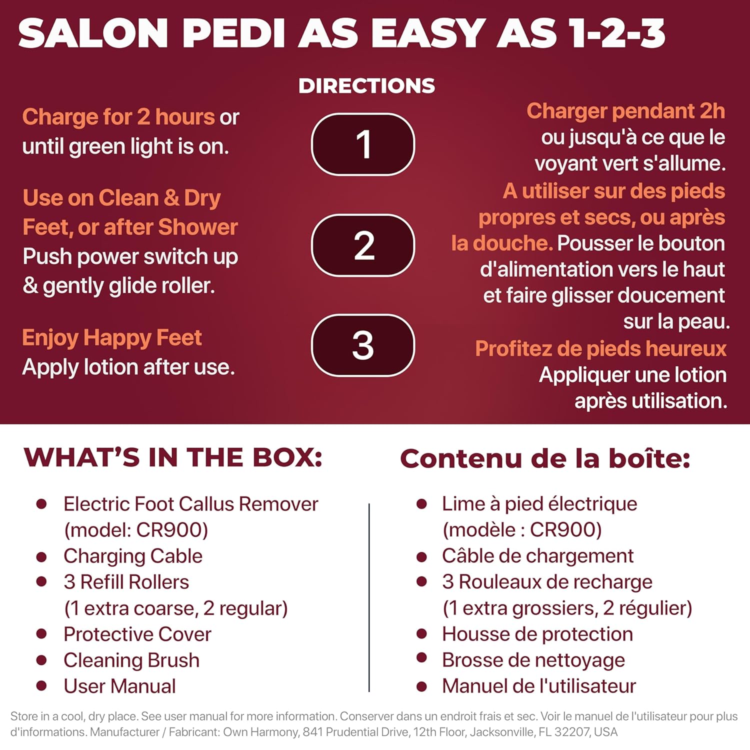 Rechargeable Callus Remover for Feet: Professional Electric Feet Sander for Women by Own Harmony - Electronic Foot File CR900 with 3 Rollers, Foot Grinder Pedi Care for Cracked Heels & Dry, Hard Skin
