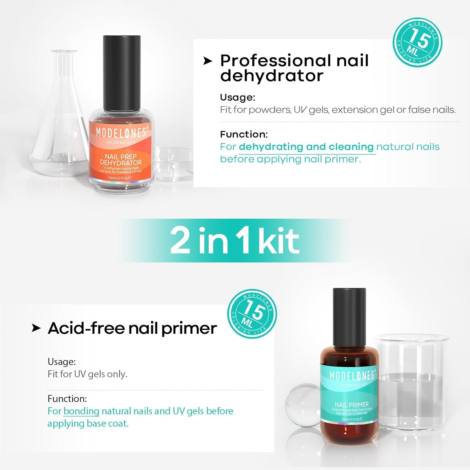 modelones 15 ml Nail Dehydrator and Primer, Acid Free Base Coat Natural Prep Dehydrate & Bond Primer Kit, Hema-Free Acrylic Nail Supplies