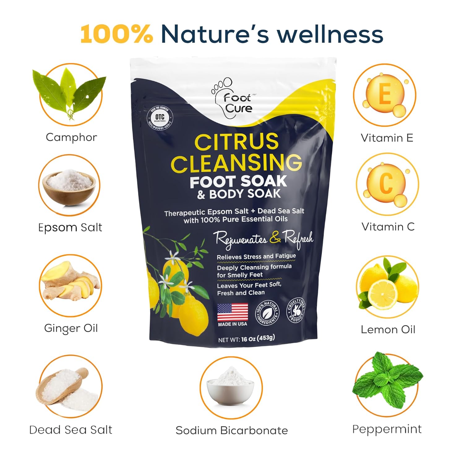 - ALL-NATURAL SKIN-PAMPERING FOOT SALT SOAK BLEND: The Foot Cure revitalizing foot soak includes 100% Pure Epsom Salts, Organic Coconut Oil, Lemon, Ginger, Peppermint, Lavender, Magnesium, Geranium Essential Oils, as well as Vitamin C and Vitamin E oil to nourish your skin and restore your feet’s health from within. The result? Spotlessly clean, glowing, soft feet that feel, look, and smell as refreshed as ever!
