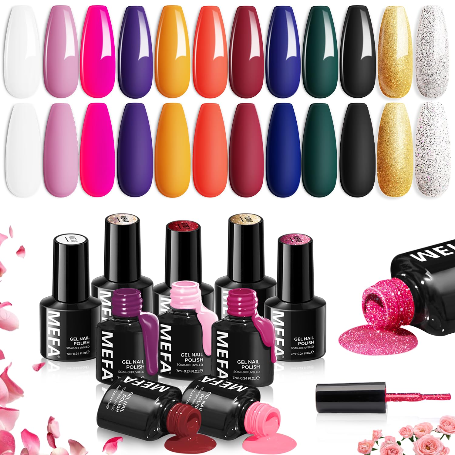 MEFA Gel Nail Polish Set, 12 Colors Gel Nail Kit Pink Red Black Glitter White Blue Yellow Purple Collection with Classic Color for Starters Nail Art Manicure at Home DIY Salon Gifts