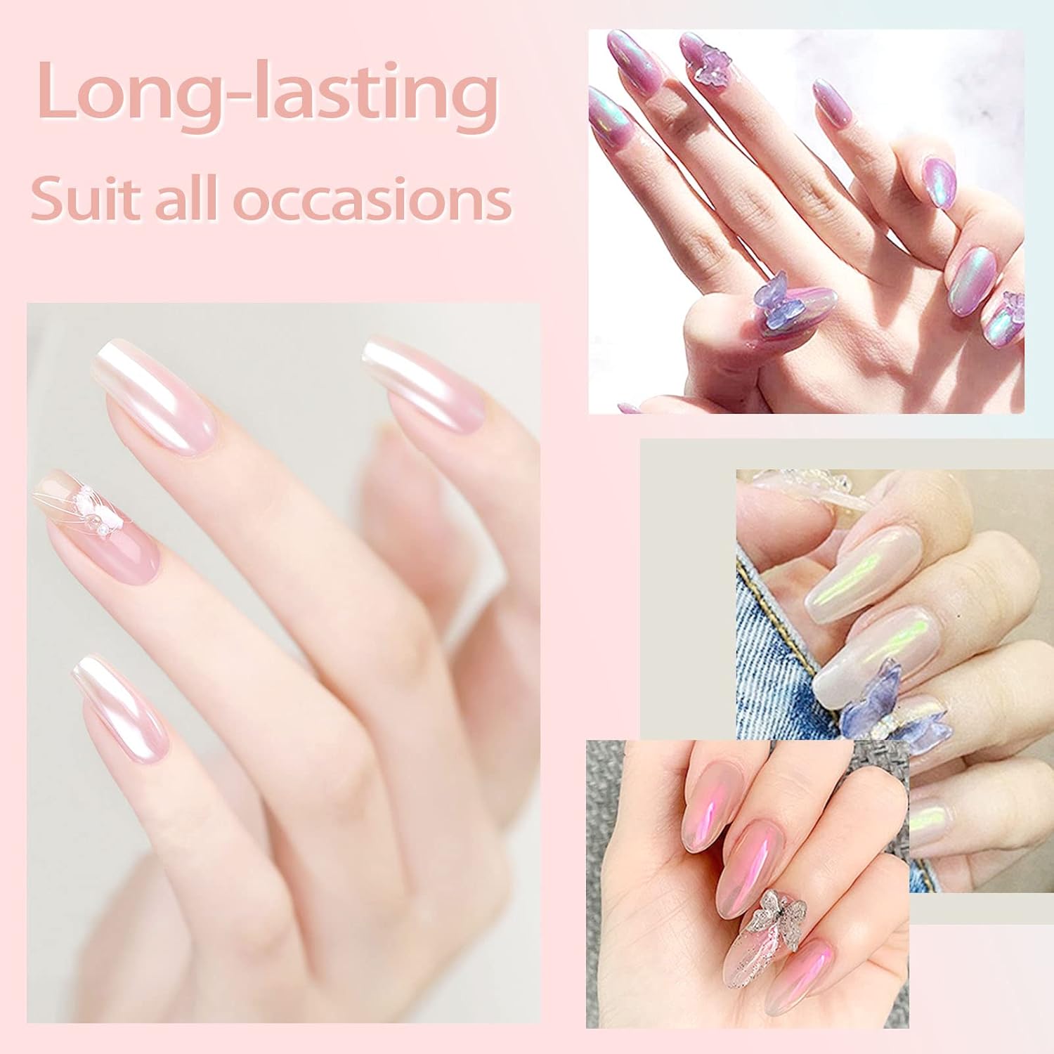 - Amazing Chrome Effect: It is an ideal chrome nail powder kit to create a aurora chrome effect. Different basecoat color leads different effect., suitable for pearl nails, candy/ice/glass effect nails, mermaid/unicorn effects, mirror effect nails, or opal nails. Create your unique nails art with Allstarry white chrome manicure pigment.