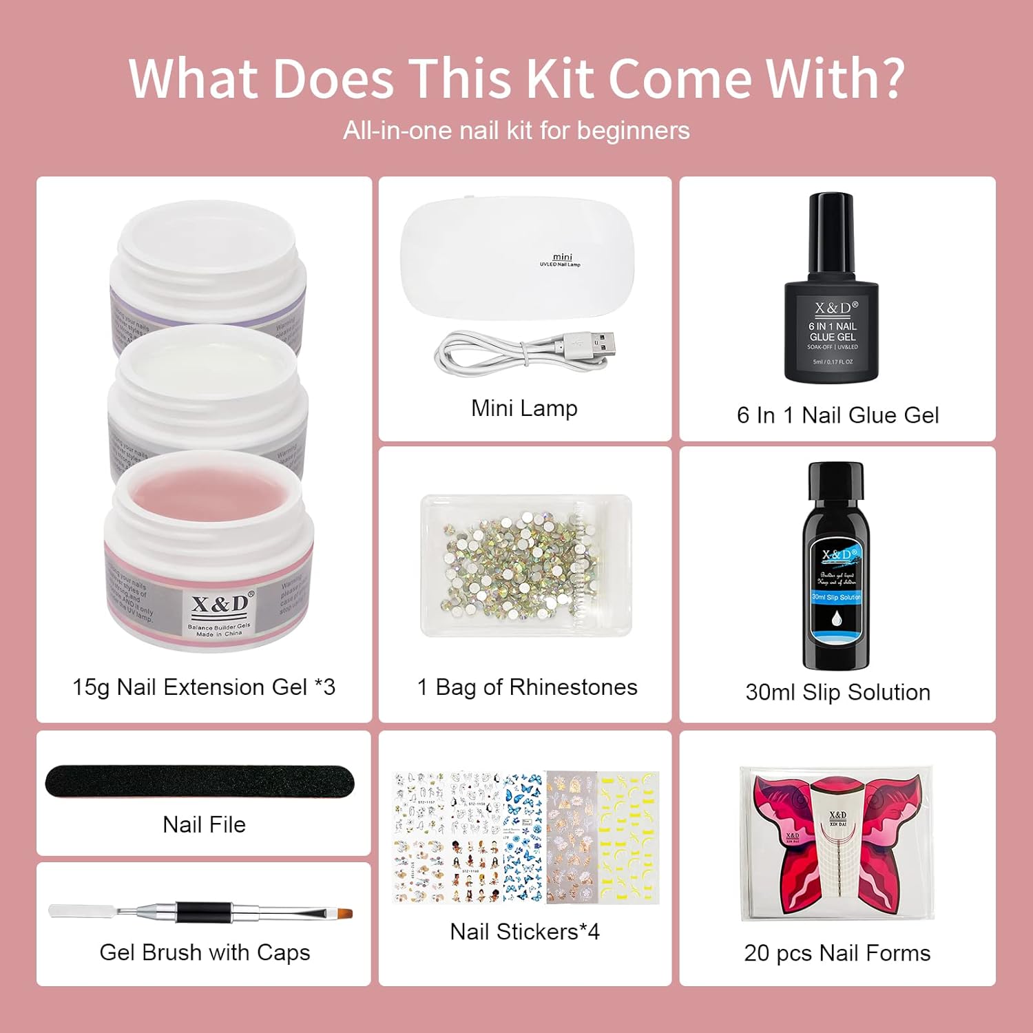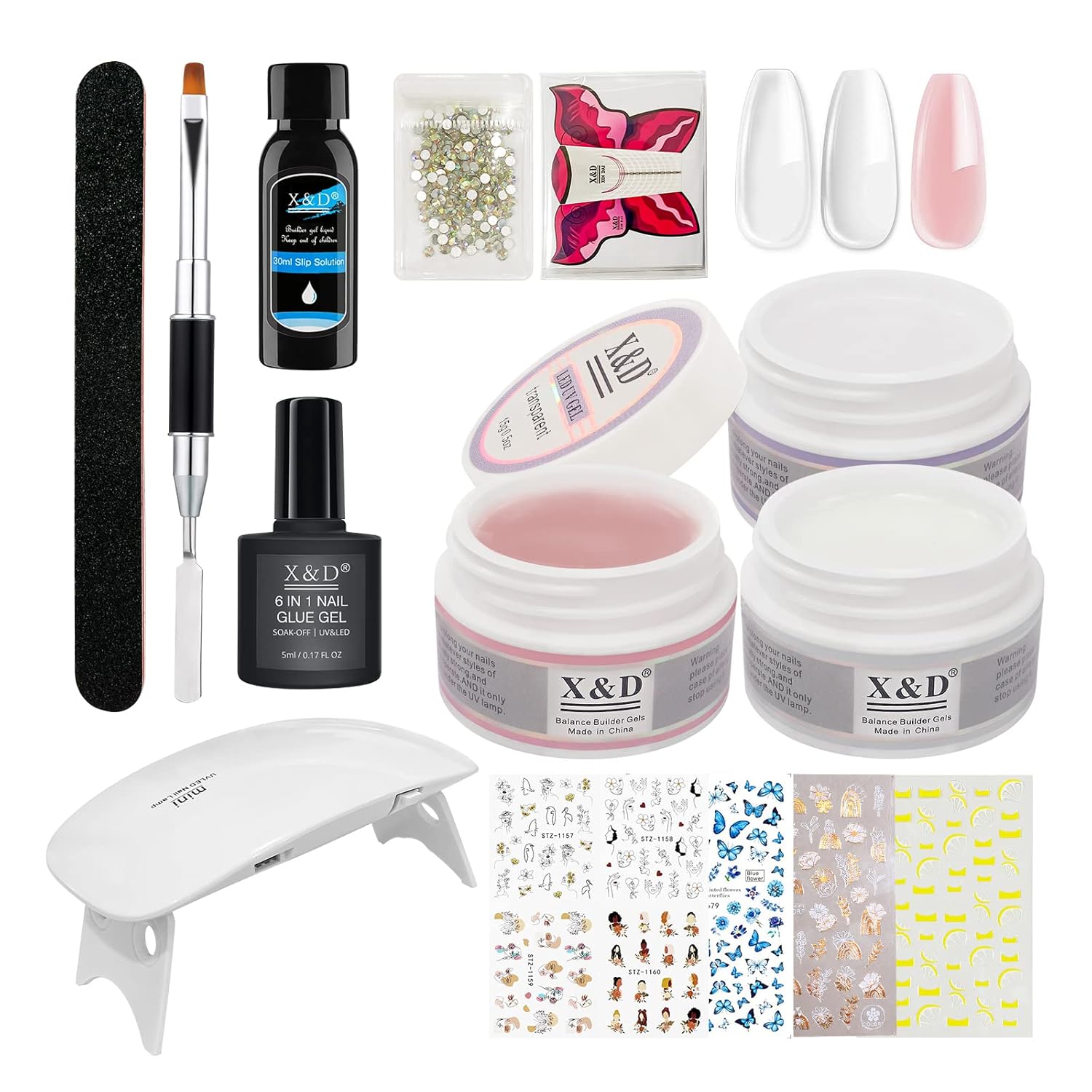 - [3 COLORS GEL NAIL KIT FOR YOU] This UV gel nail polish kit consists of 3 colors of 15 ml polygel, sable brush, nail file, multifunctional nail glue gel, rhinestones, 4sheets of nail art stickers, UV light, slip solution and 20pcs nail forms. White, transparent and nude pink provided will make you natural or Japanese style customized nail art.