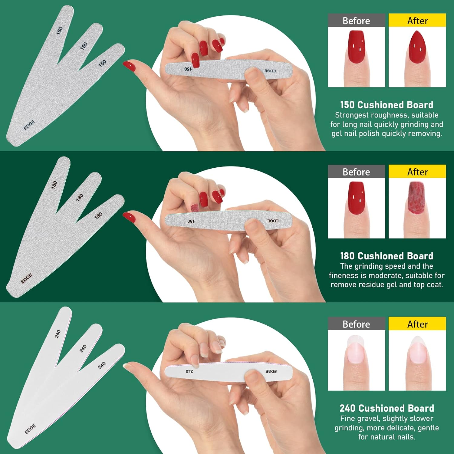 - High Quality Nail File Kit: The nail polish remover set contains 6 pcs nail files of different roughness, each nail file and nail buffer is marked with a corresponding number so you know exactly which file to use for shaping or polishing your nails. Both sides can be used, gentle on natural nails, high tough material is not easy to deformation. (EDGE: 150, 180, 240, FLEX: 100/180, 220/280, SHINER: 1000/4000)