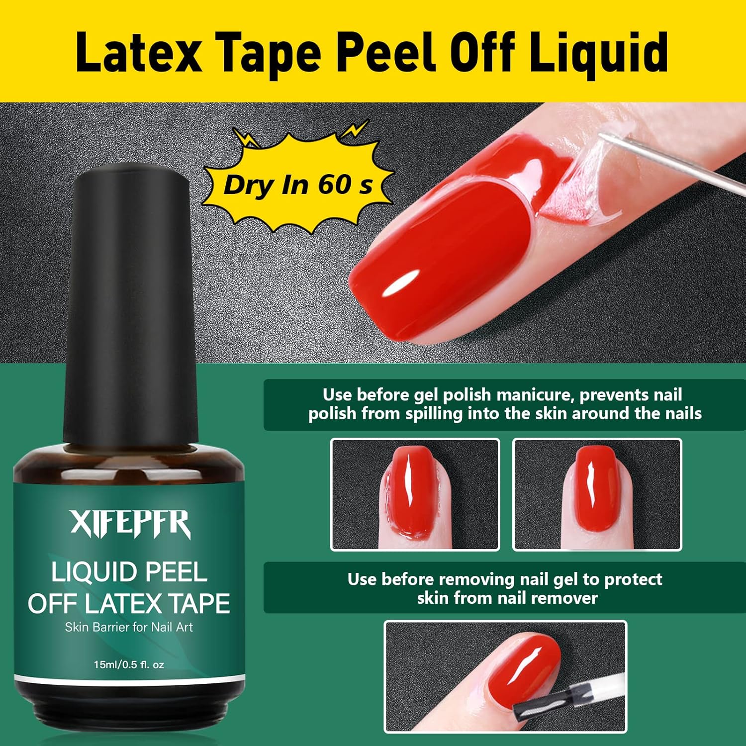 - Liquid Peel Off Latex Tape: Apply liquid latex to the skin around the nail and wait about 60s for a dry soft gel to form. It is a natural protective barrier, use before applying gel nail polish remover to prevent gel nail remover from coating the skin. Use before manicure to prevent spillage onto the skin when applying nail polish. Easy to clean up, no skin damage.