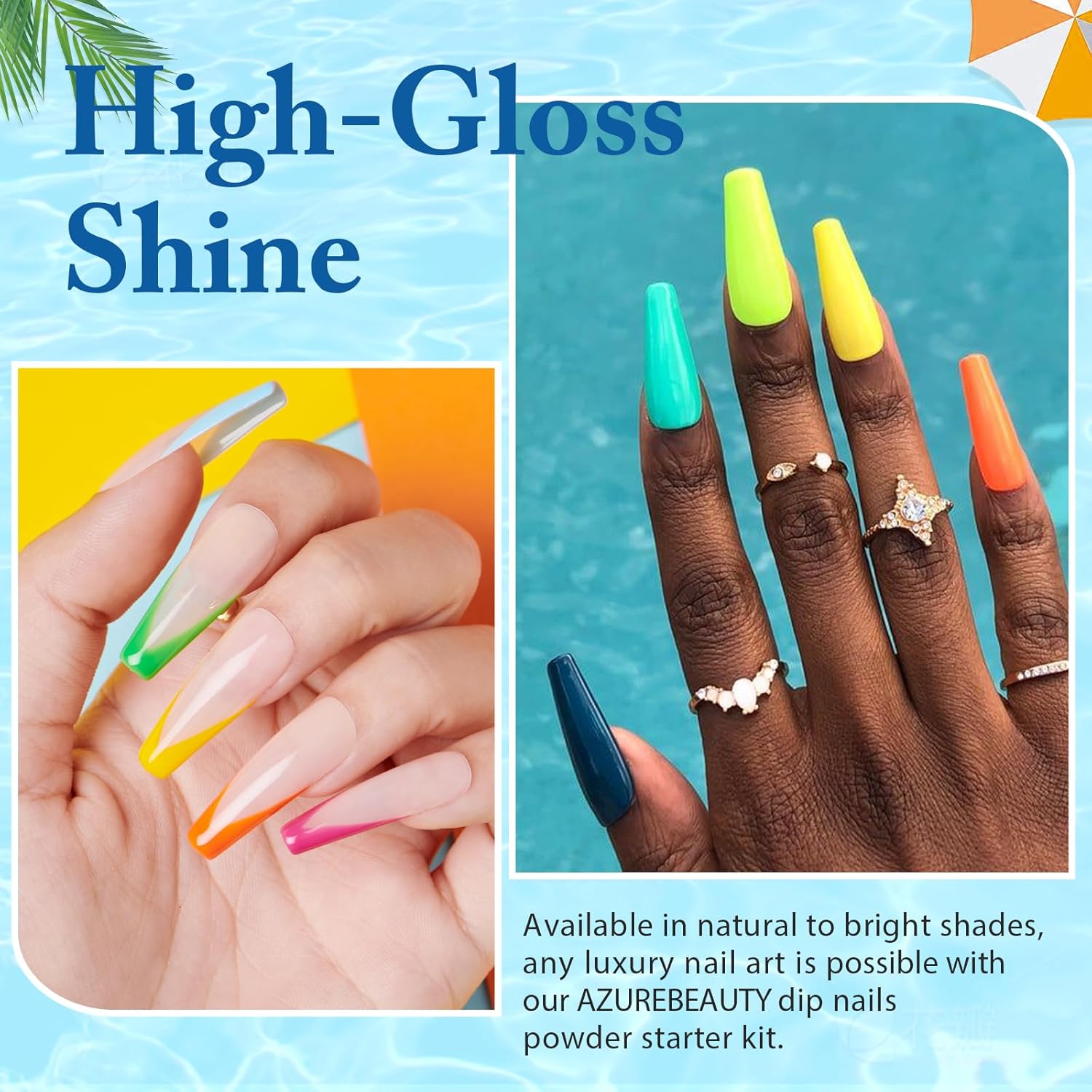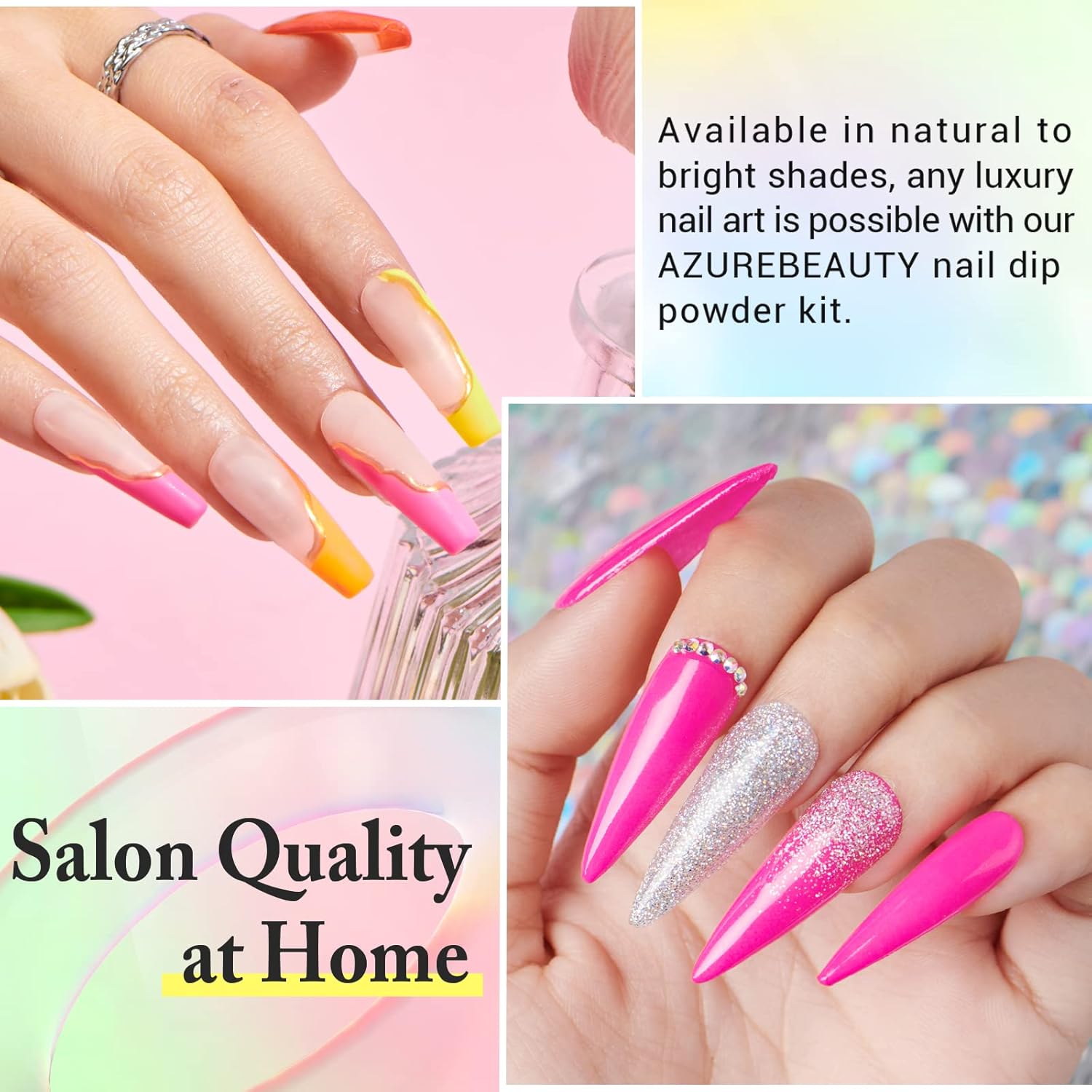 - 【Superior Quality & Long Lasting】 AZUREBEAUTY nail dip powder kit is long-lasting and anti-chipping, anti-peel off. The color is full and natural-looking, light, and has an impeccable shine finish. It can keep the nail art gorgeous and shiny for more than about 28 days with proper application. This makes it the first choice for busy people. (REMINDER: The affection of dip powder may show differently in different people, 2~3 base coats while using will be the best.)