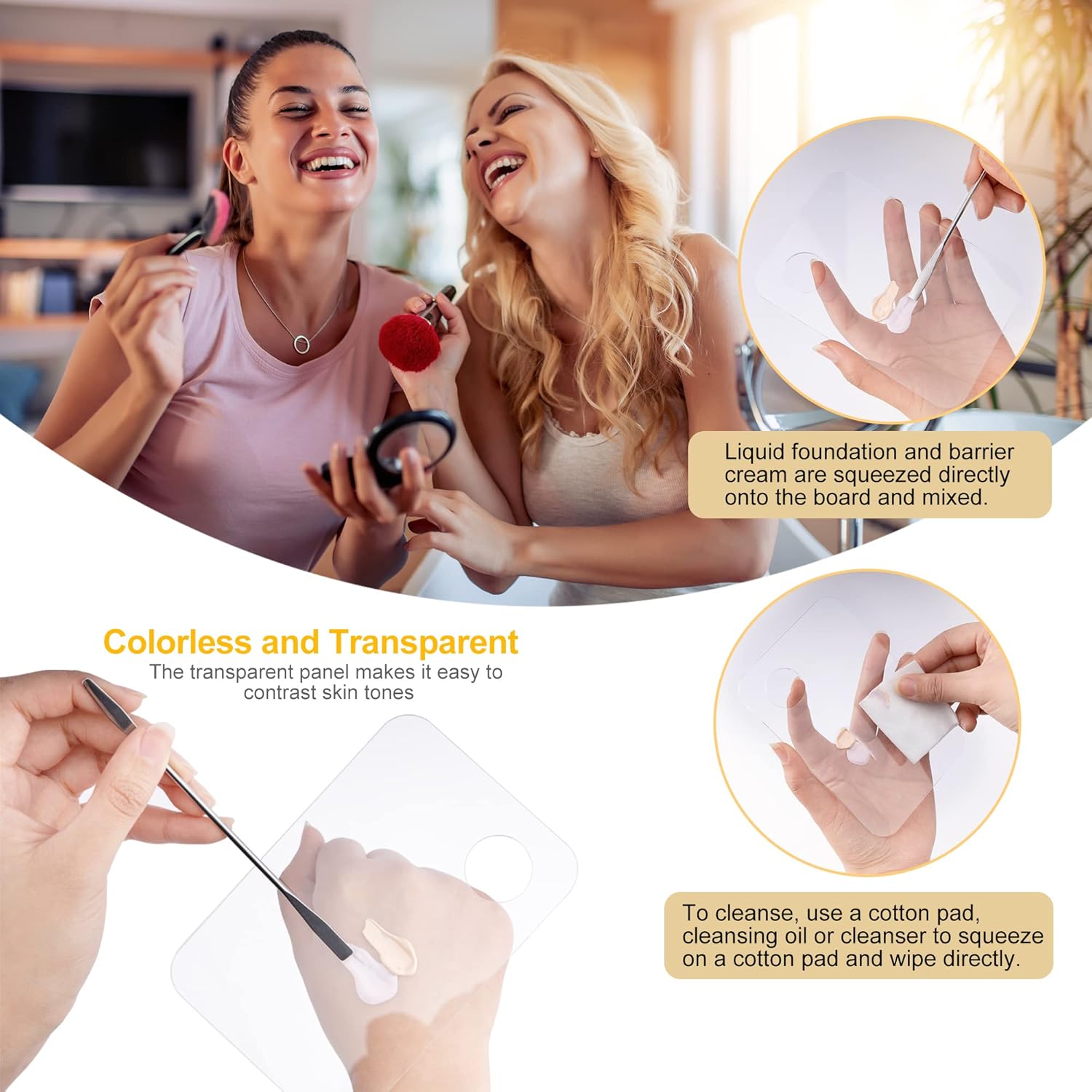 - Large Acrylic Foundation Mixer Tray :There are enough sizes to adjust a variety of cosmetic colors. You can adjust the liquid foundation and cream on the same board. Lightweight and easy to carry. Mixing without dirty hands. Clear color display, beautiful, direct color comparison