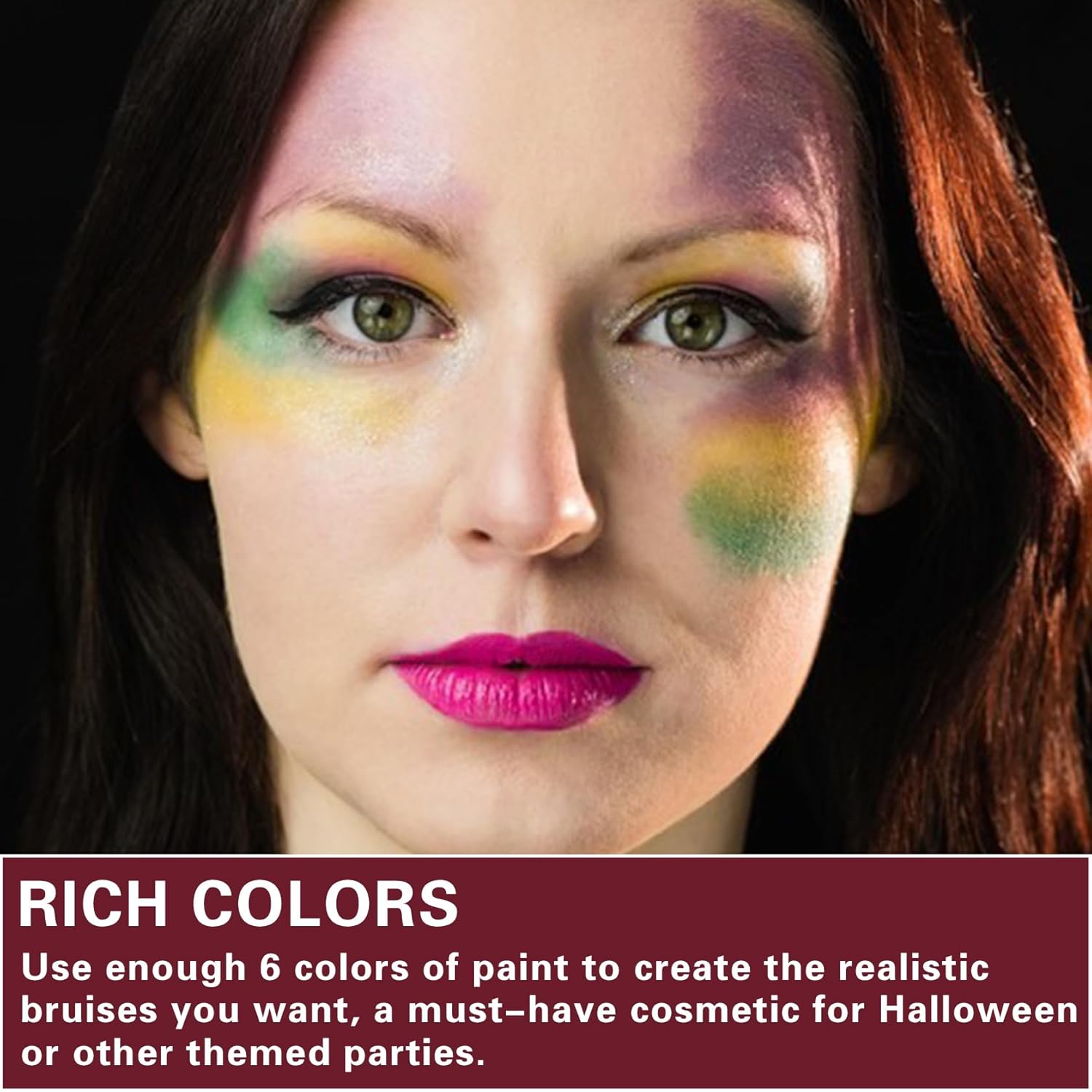 - 【How to Use】Apply to the skin with a makeup brush or sponge. First, use red to create the new bruise, then brown to darken it a bit, then add black or purple and yellow or green to create the older bruise around it. You can use setting powder or setting powder spray for better results.