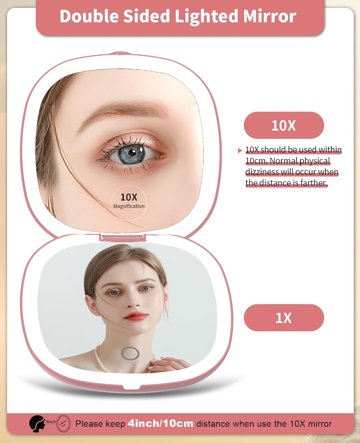 - 10x Magnifying:One side is a 1x HD mirror, equipped with white light to better restore your beauty, and the other side is a 10x magnifying mirror, which findfantastic for detailed makeup application and tasks like pluckingeyebrows. Tip: When using the 10x magnifying mirror, please keep a distance of less than 10 cm,then the mirror image will not be distorted