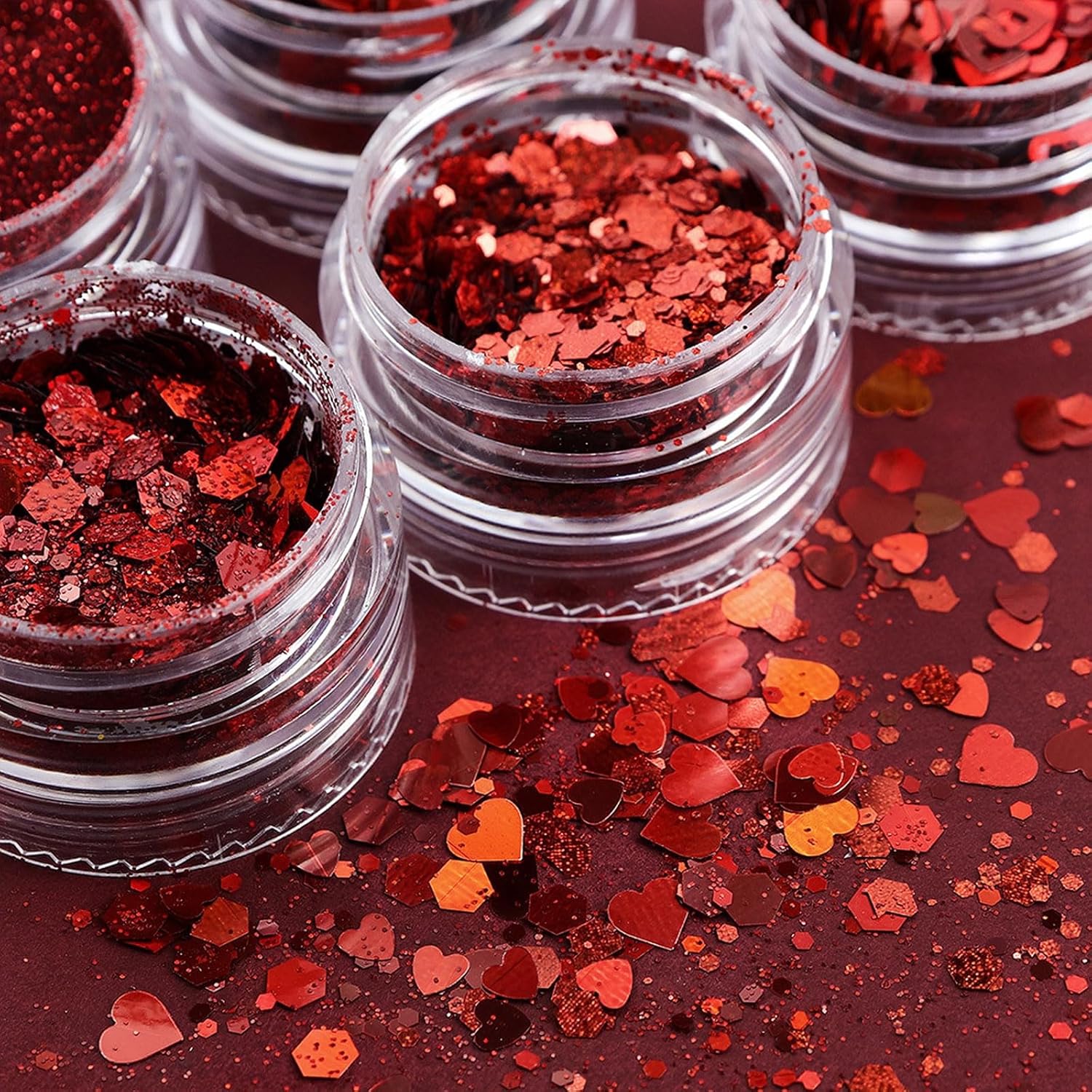 Heart Nail Art Glitter Red Valentines Day Nail Sequins Flakes, Red Manicure fine Glitter Powder, 3D Holographic Round Hexagon Nail Stickers Decals Supplies Nail Charms for Women 6 Box