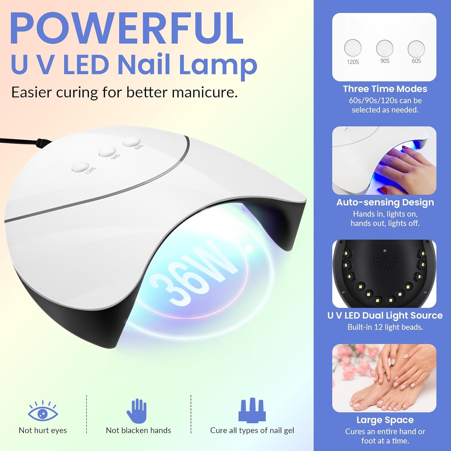 - ăPowerful U V/LED Nail Lampă Professional nail light in this gel nail polish kit has three time options: 60s/90s/120s, and automatic sensor design, allowing you to easily control the curing of gel nail polish. U V/LED dual light source design, with 12 lamp beads, can efficiently cure almost all kinds of nail gels, not hurt your eyes, not black hands. Enough space to cure a whole hand or foot, bring you high quality nail art curing experience.