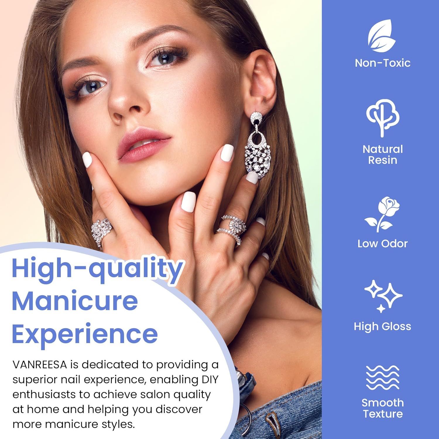 - ăHealthy & Long Lasting Manicureă VANREESA gel nail polish ingredients are made of natural resins, which are safe, non-toxic and low-odor, so you can use them with confidence. VANREESA gel nail polish is silky smooth, brightly colored and easy to apply, so even beginners can master its use. Prepare well before you start (shaping, buffing, cleaning) and follow the correct steps in the manicure instructions and your nail art will last for 21+ days!
