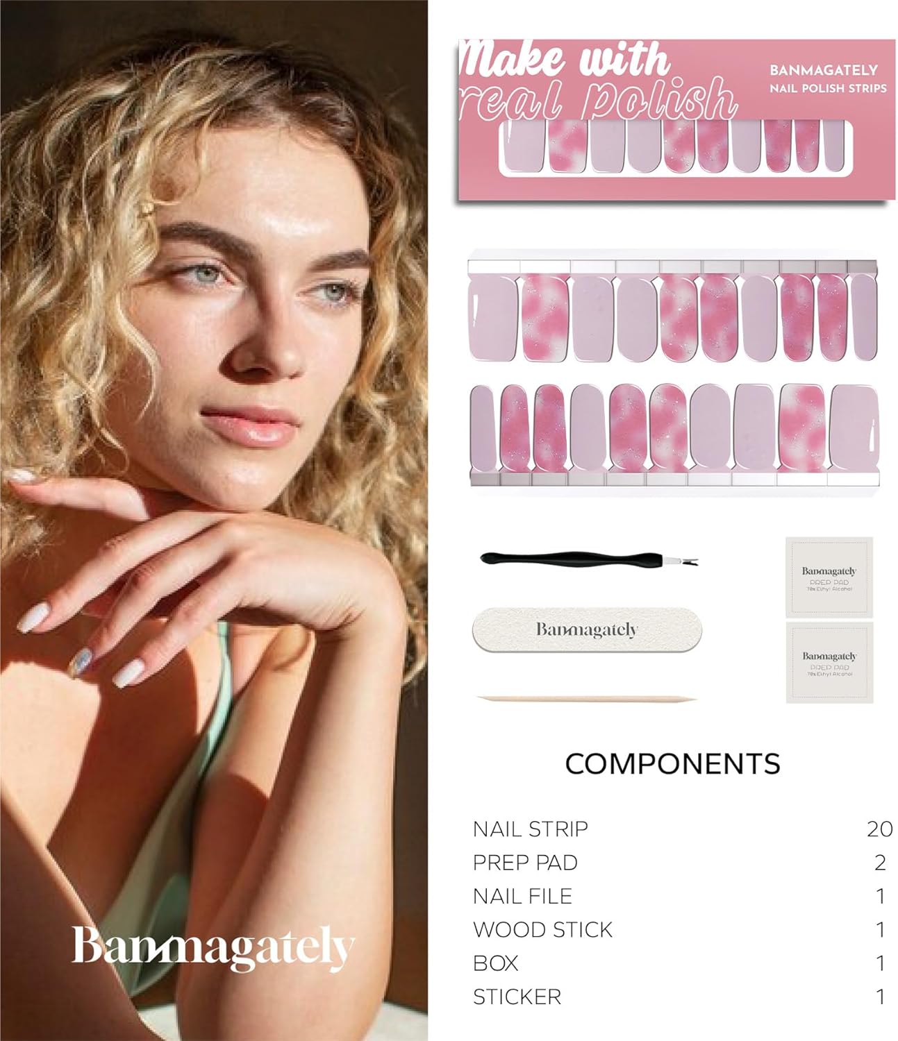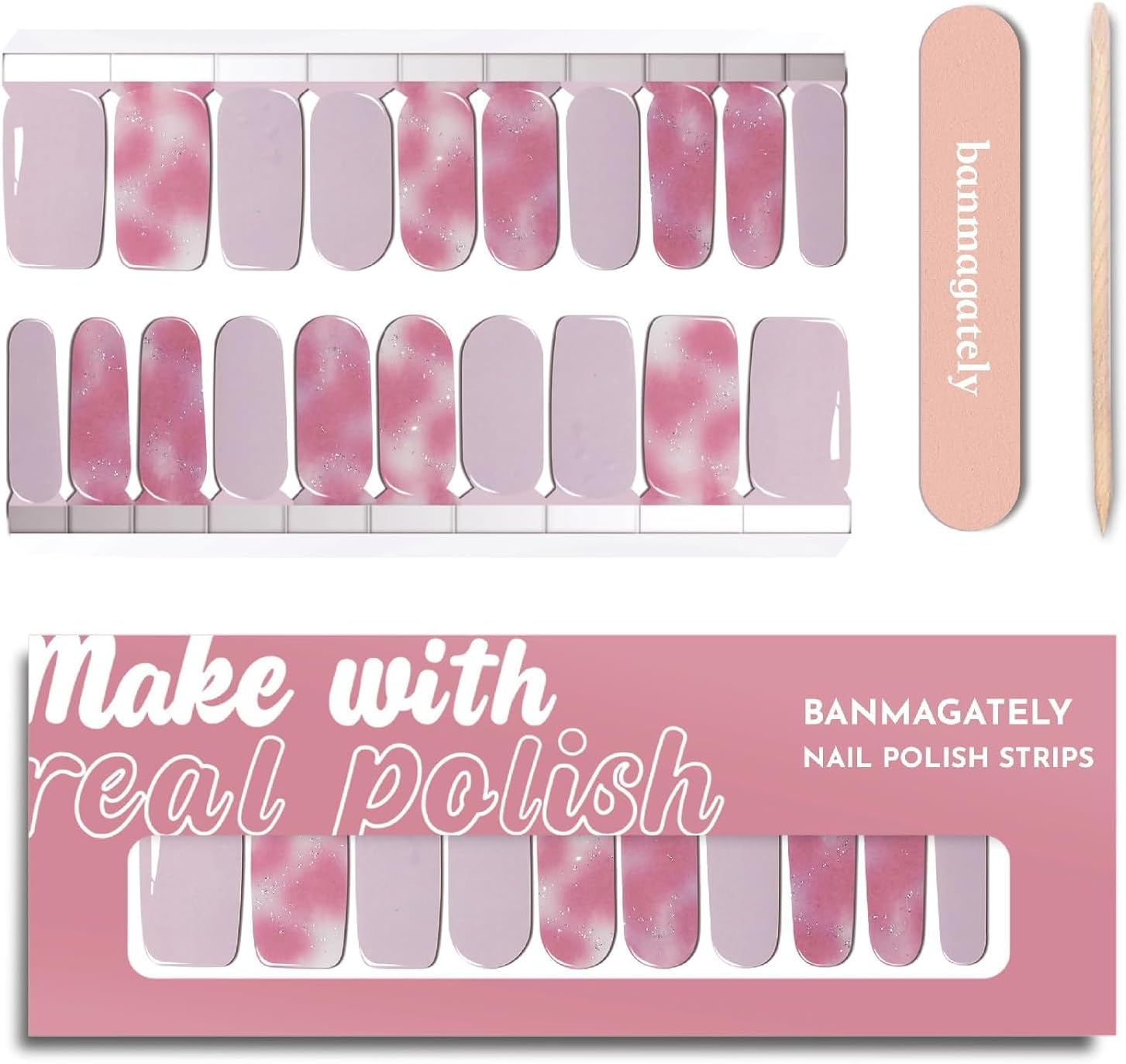 - Package Include: The whole product includes 20 pieces Water resistant Polish Nail Strips , 2 Cleaning Wipes, 1 Wood Stick, 1 Nail File, and 1 instruction manual.