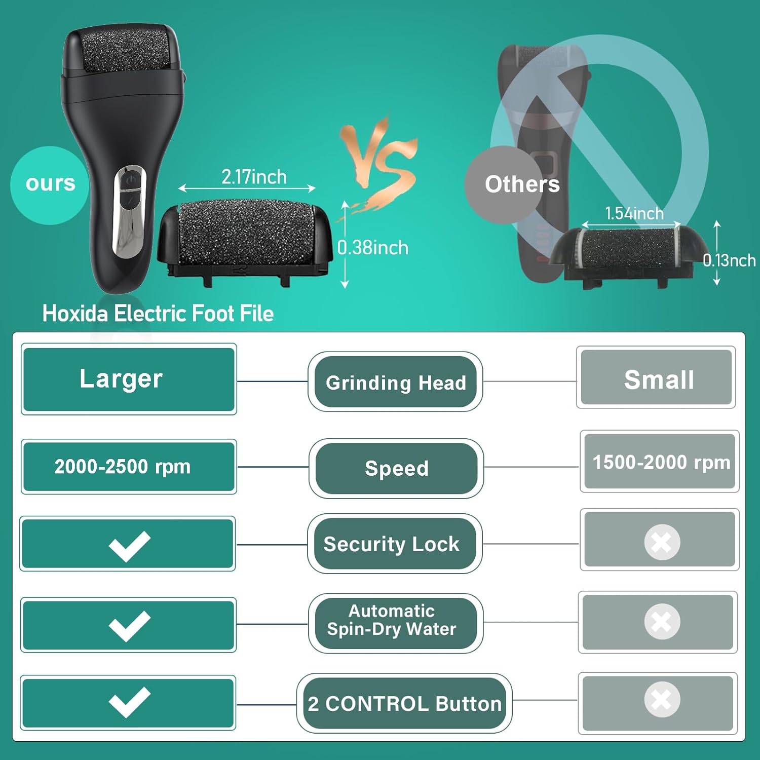 - Electric callus Remover for feet, Powerful & Faster ----- Electric Foot Callus Remover with 2x Strong Motor to buff away hard, dead skin in High Speed, Reveal baby-soft skin in minutes with no prep time. this pedicure tools for feet is with upgrade 2500RPM and 2 Speed- Fast grinding without damage to the healthy skin, best callus remover for feet, Ideal pedicure spa kit gift for men and women.