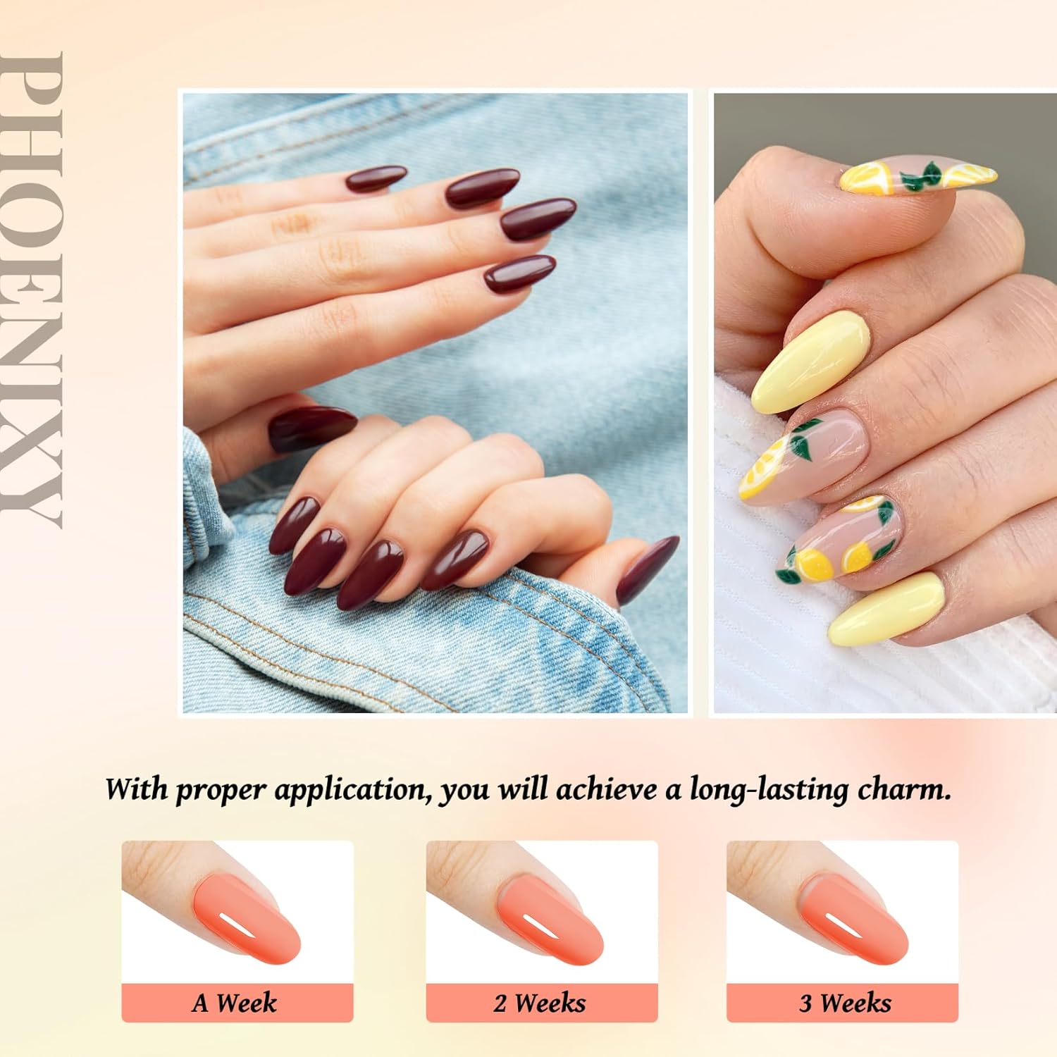 - [Long Lasting & Easy Application] -- Phoenixy gel nail polish lasts for 28+ days with a perfect shine when applied properly. Its soft brush allows for smooth, multi-directional application, making it suitable for all nail types and ideal for both beginners and experienced nail artists.