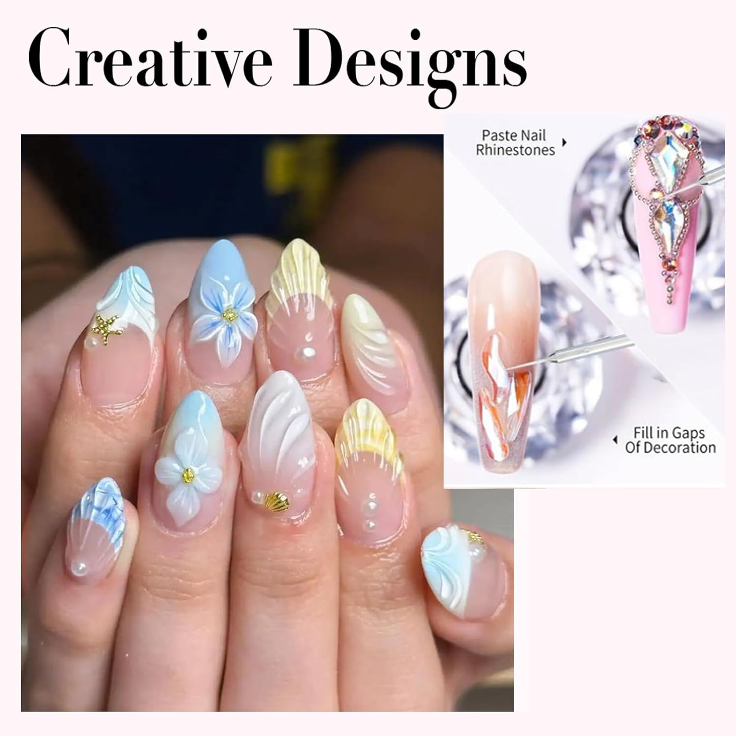- Applied to Nail Decoration: It can bond small rhinestones or pearls and other exquisite ornaments, and used as pulling glue to outline various lines and styles