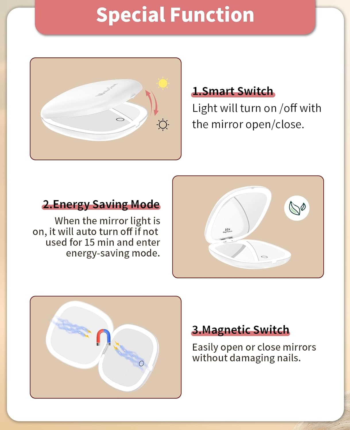 - 10x Magnifying:One side is a 1x HD mirror, equipped with white light to better restore your beauty, and the other side is a 10x magnifying mirror, which can help you magnify facial details. Tip: When using the 10x magnifying mirror, please keep a distance of less than 10 cm, otherwise it may cause normal dizziness and affect imaging