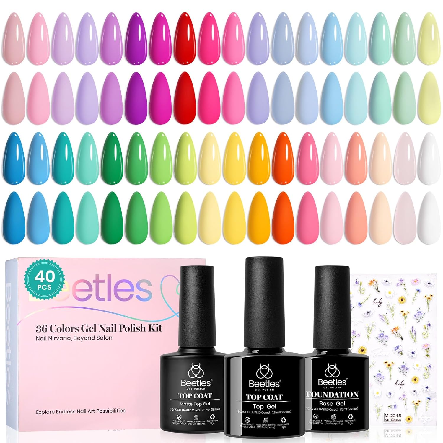 - 【What You Get】: Beetles 40 Pcs UV gel nail polish set include 36 x Mini All Season Gel Nail Polish + 3 x No Wipe Base and Glossy and Matte Top Coat +1x Floral Stickers , 1 x Instruction Manual . This natural green red blue purple pink orange gel polish set is an essential for everyone!