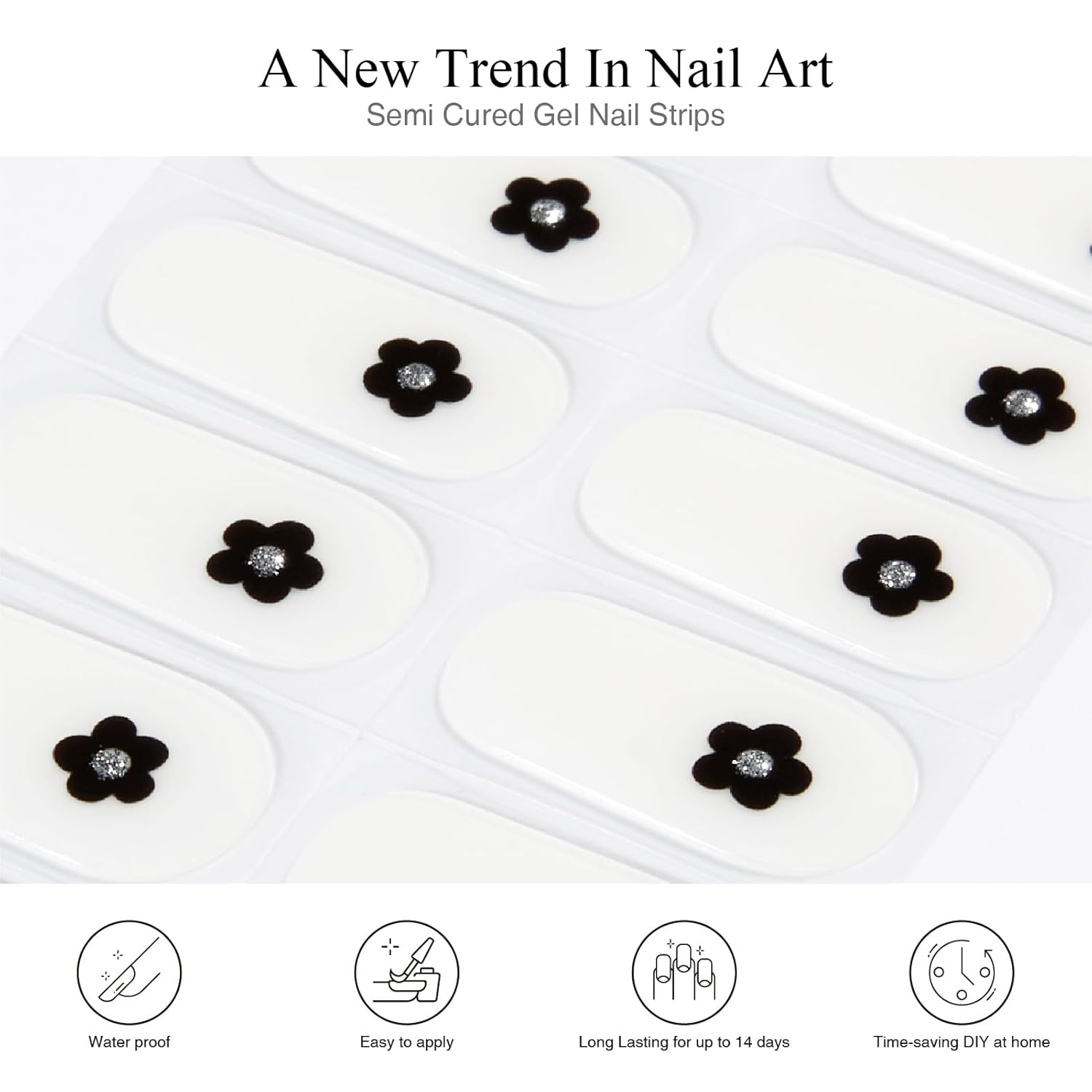 Semi Cured Gel Nail Strips, 20 PCS Gel Nail Stickers Work with UV Light, Gel Nail Wraps, Salon Quality & Easy to Use - Midnight Floral