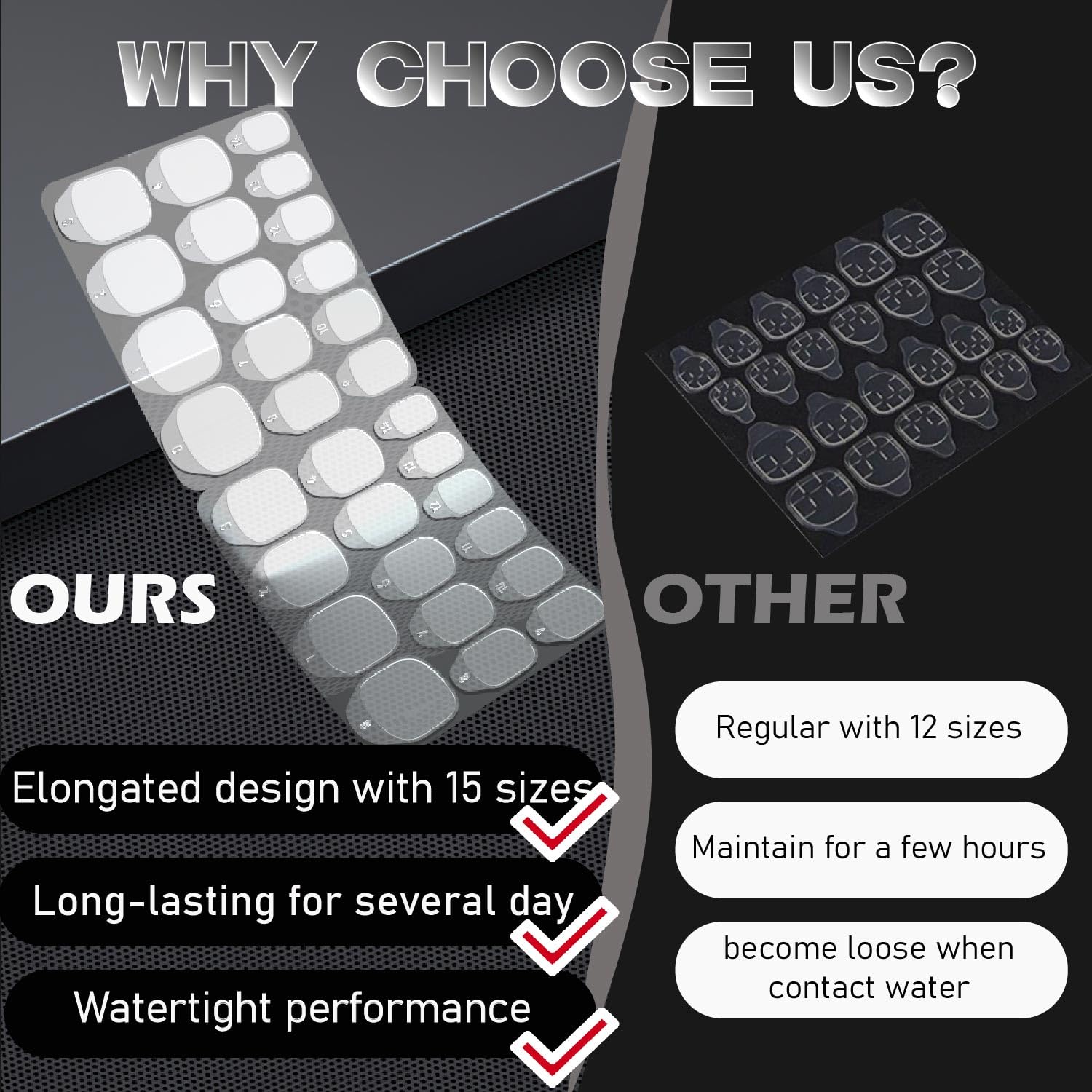 - 【Waterproof & Durable】 Made with high-quality Korean materials, our press on sticky tabs are watertight and stay put during daily tasks. They help your press on nails last up to 15 days without popping off.