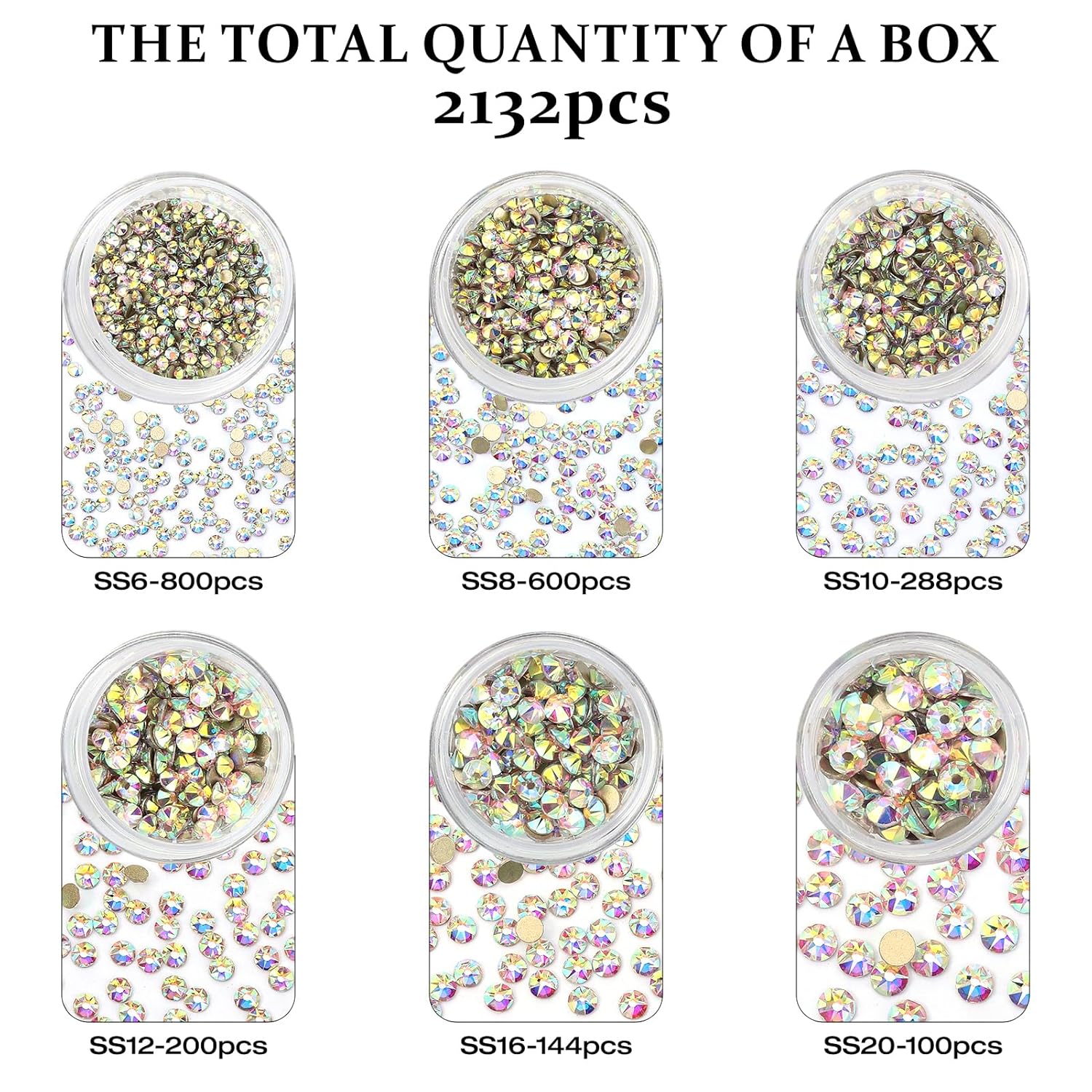 - Rhinestones: Pack of 2132 Pieces Crystal AB Rhinestones, mixed 6 sizes, SS6 (1.9-2.0mm), SS8 (2.3-2.5mm),SS10 (2.7-2.9mm),SS12 (3.0-3.2mm),SS16 (3.8-4.0mm),SS20 (4.6-4.8mm).