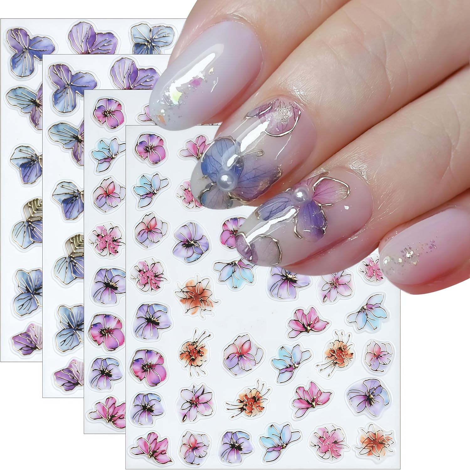 4 Sheets Purple Gold Flower Nail Art Stickers 5D Embossed Flowers Self-Adhesive Pegatinas Uñas Colorful Petals Nail Decals Purple Flower Nail Stickers for Women Nail Art Decoration