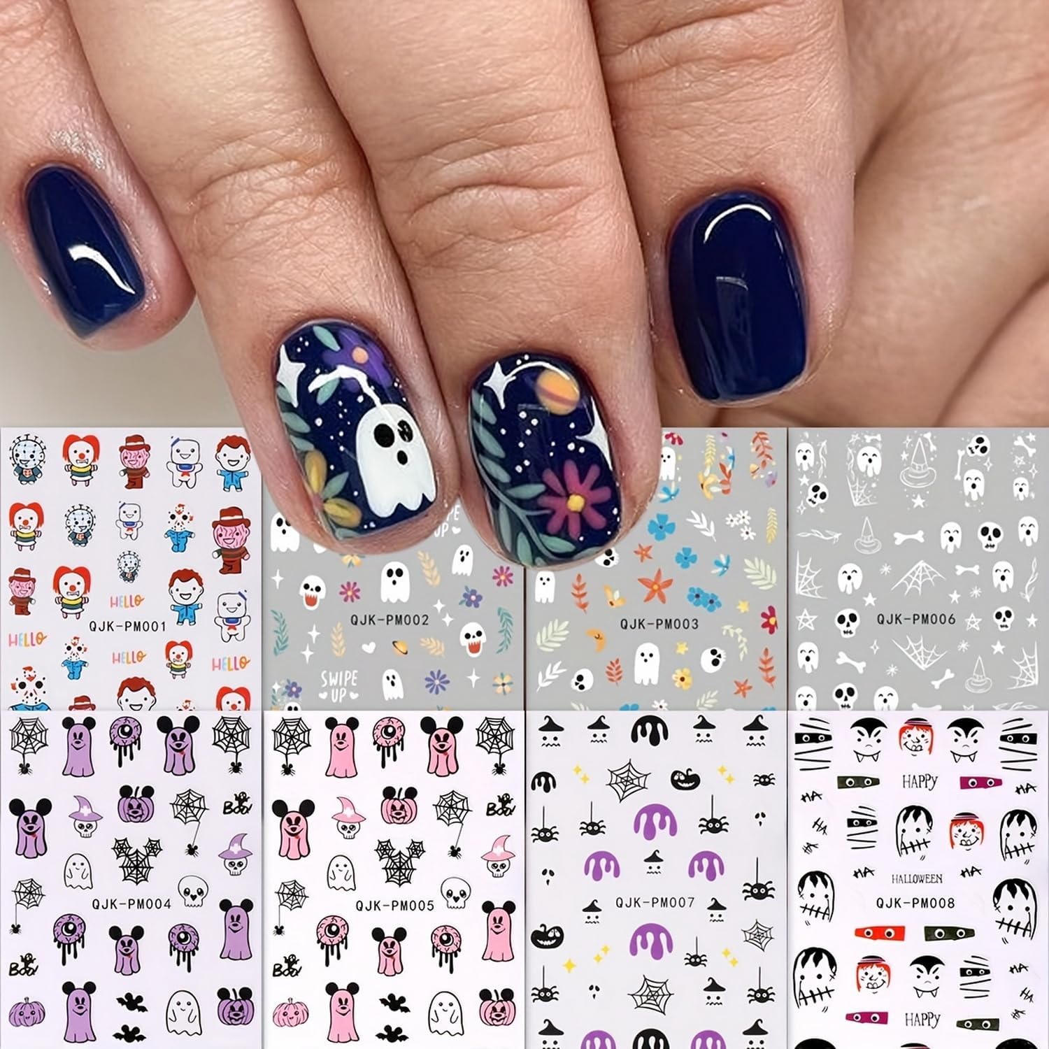 Halloween Nail Art Stickers 8 Sheets Cute Ghost Pumpkin 3D Self-Adhesive Nail Decals Q-Version Horror Movie Characters Skull Spider Web Nail Decorations Fall DIY Nail Supplies for Women Girls&Kids