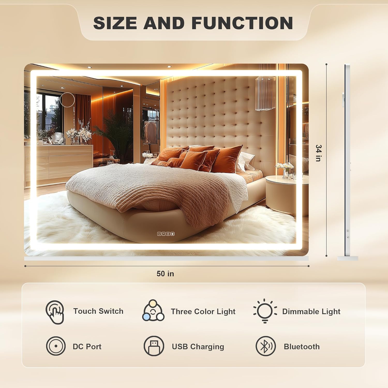 Hasipu Vanity Mirror with Lights and Bluetooth Speaker, 50.2" x 33.9" LED Makeup Mirror, Lighted Makeup Mirror with Dimmable 3 Modes, Touch Screen Control Vanity Mirror Round White