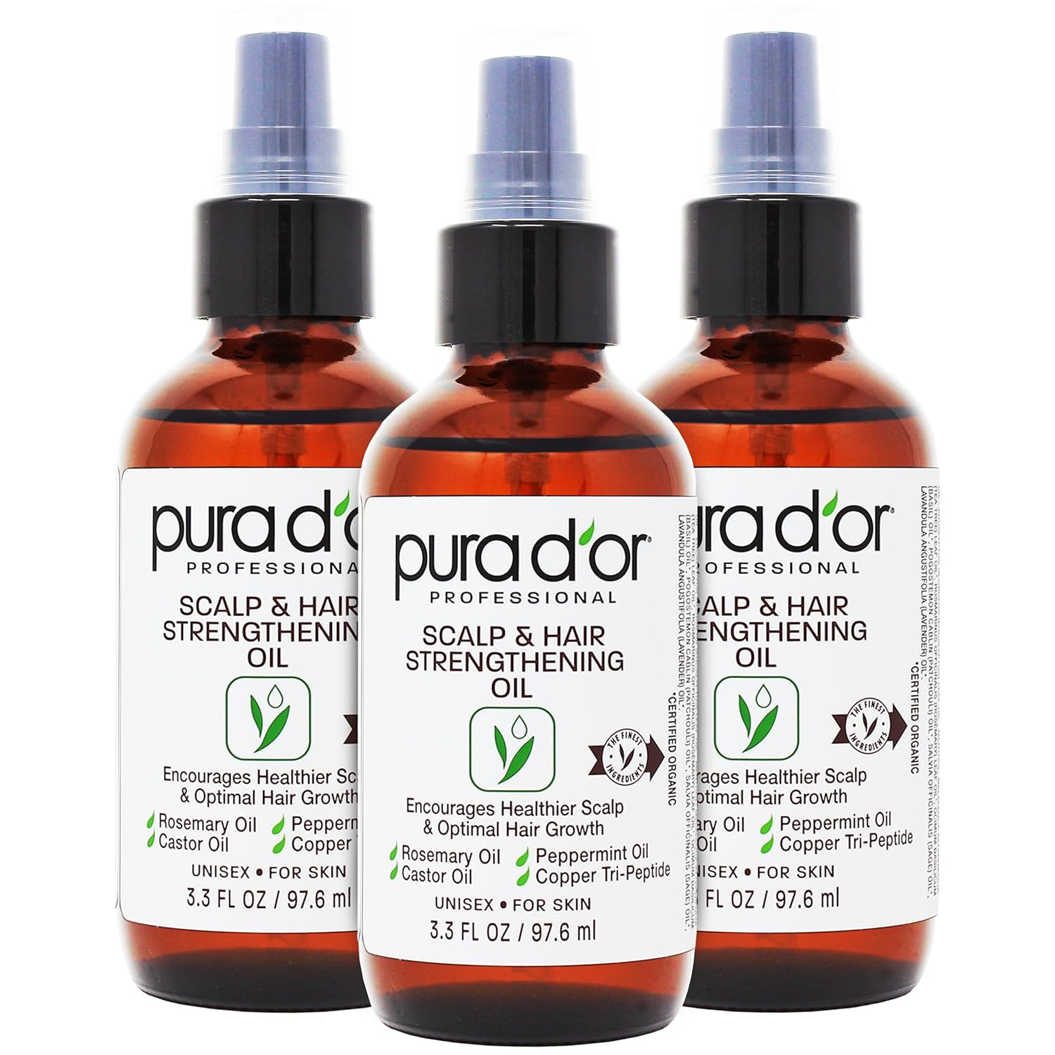 PURA D'OR Scalp & Hair Strengthening Oil (3.3oz x3 = 9.9oz) Supports Optimal Growth, Reduce Breakage, Nourish Roots for Healthier, Fuller, Thicker Hair - Rosemary, Castor & Peppermint Oil