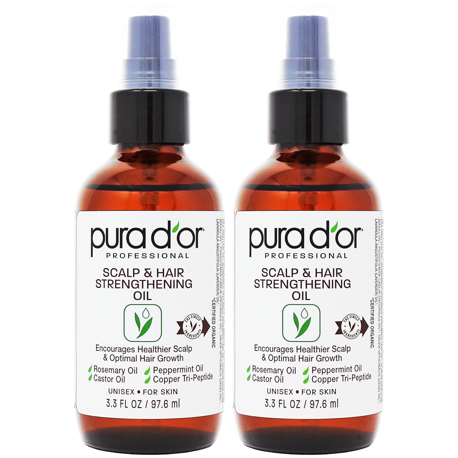 PURA D'OR Scalp & Hair Strengthening Oil (3.3oz x2 = 6.6oz) Supports Optimal Growth, Reduce Breakage, Nourish Roots for Healthier, Fuller, Thicker Hair - Rosemary, Castor & Peppermint Oil
