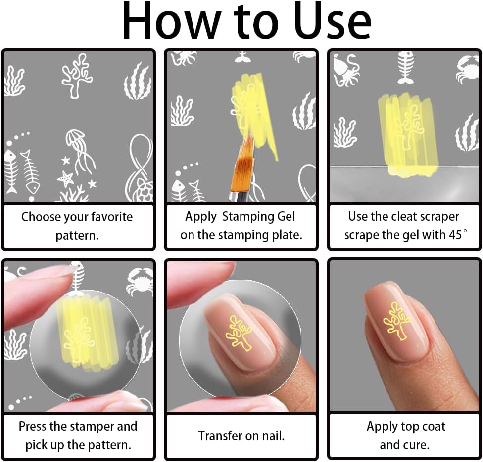 - Easy to Use: 1. Apply paint adhesive to the stencil, then use a scraper to quickly scrape off the excess 2.Use a silicone stamper to press down on the transfer pattern 3. Quickly transfer the pattern onto your nails 4.Bake dry to apply sealer then shine the lamp