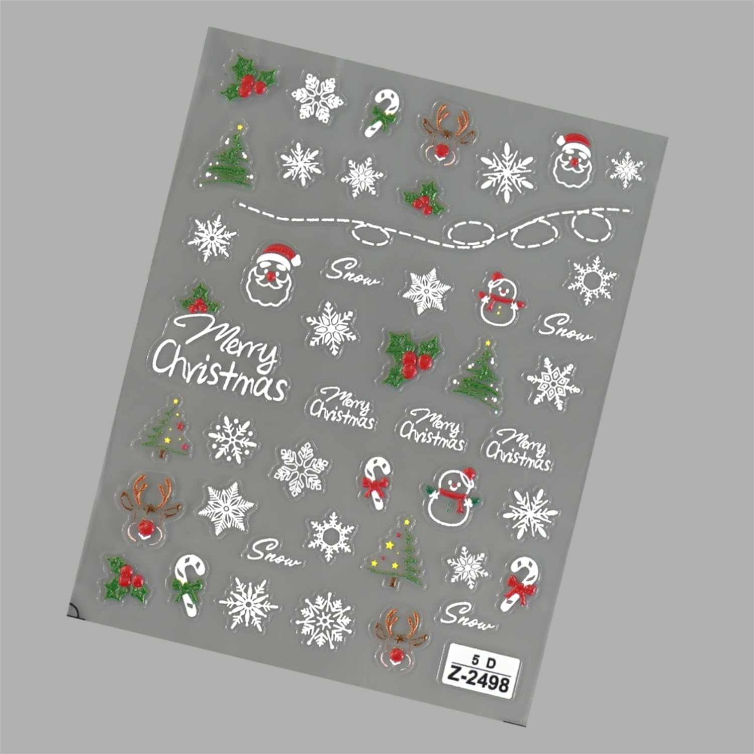 - ăChristmas Nail Art Suppliesă5D embossed self-adhesive nail decals for nail art with charming winter and Christmas motifs such as Santa Claus, snowman, and snowflake.These designs capture the essence of the season, making them ideal for women and girls to embrace the winter charm.