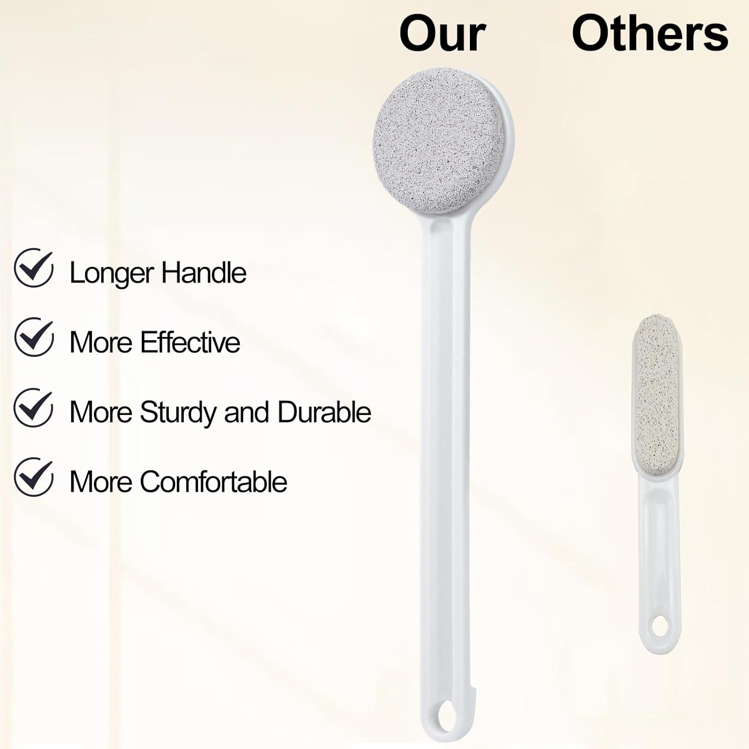 - Long Handle Design: The 14-inch long handle pumice stone allows for comfortable use and easy reach to the bottom of feet. It has a hanging hole for easy storage. Our foot pumices is a perfect gift for seniors, pregnancy and people with back or legs pain etc