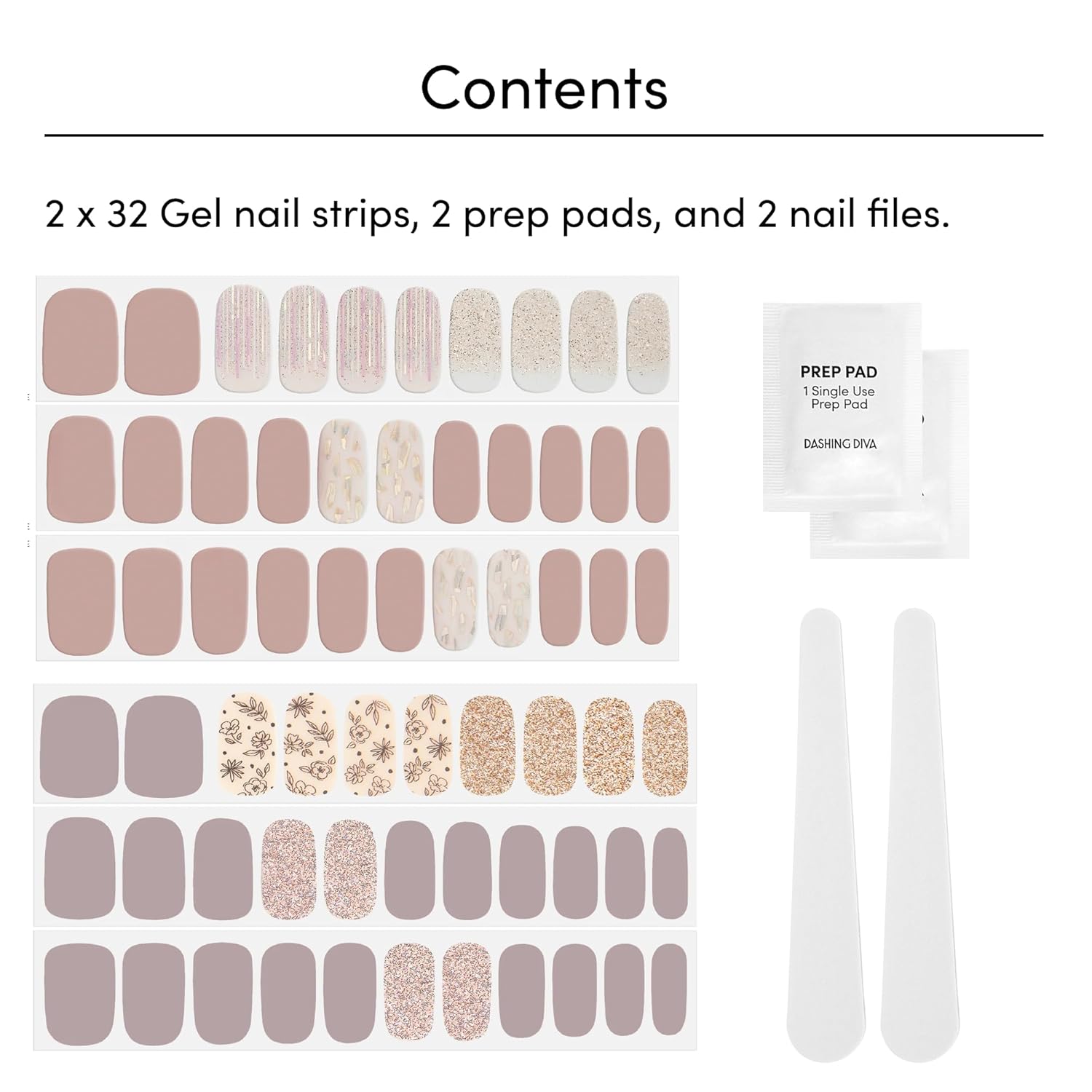 - Includes: 2 x Gel Strip Sets. Each set includes 32 gel manicure strips (20 base color, 12 accent), 1 prep pad, 1 nail file. Easily remove nail strips with nail oil or acetone
