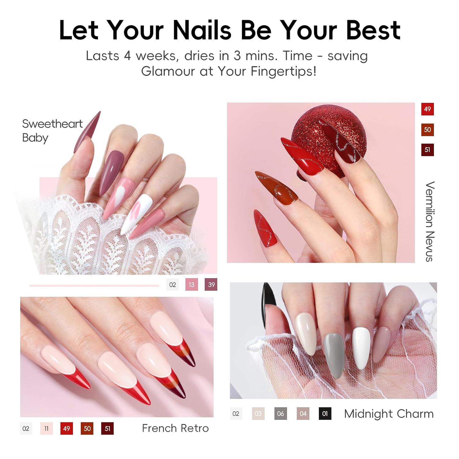 - Decorative Accessories :This gel nail polish kit comes with nail art stickers,french nail Sticker, foil flakes for decoration.You can pair the gel nail polish with these decorations, Create french nails or extension nails at home .With the right prepar you can enjoy the long lasting gel polish for up to 2-3 weeks at least.