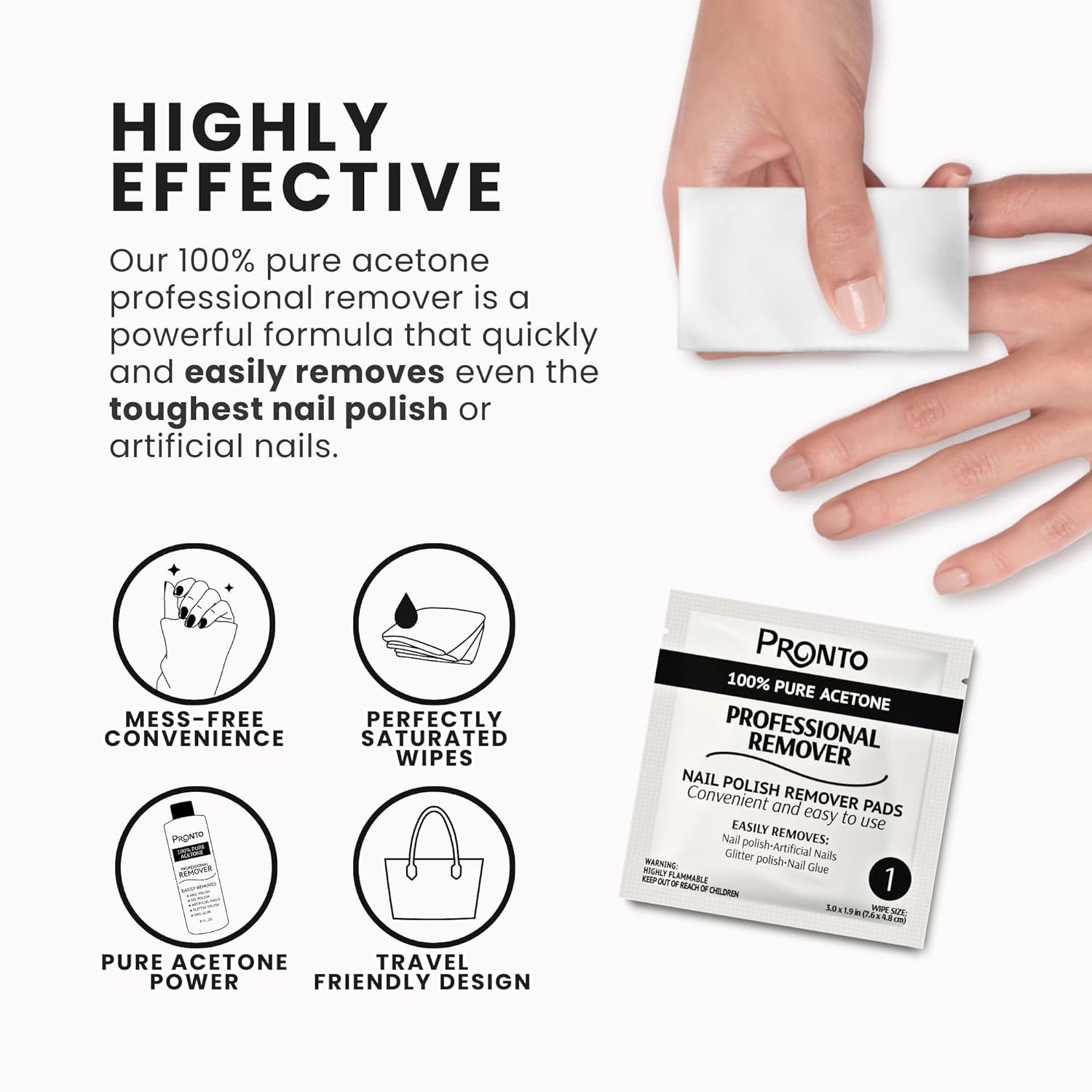 - PREMIUM QUALITY PRODUCT: Made with 100% pure acetone, our Pronto Gel Nail Polish Remover Pads ensure efficient polish removal. Designed for convenience and effectiveness, they’re a trusted choice for hassle-free nail care.