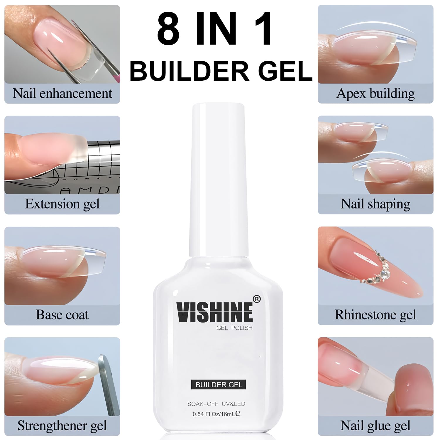 - Exclusive 8-In-One Builder Nail Gel: Designed with innovative formula, this versatile clear gel builder is ideal for 8 amazing applications including as thickening overlay, building apex, extending length, shaping nail, to attach false nail tips / gems / jewels and as a base gel. Note: Need to be cured under U V / LED lamp for 60-90s