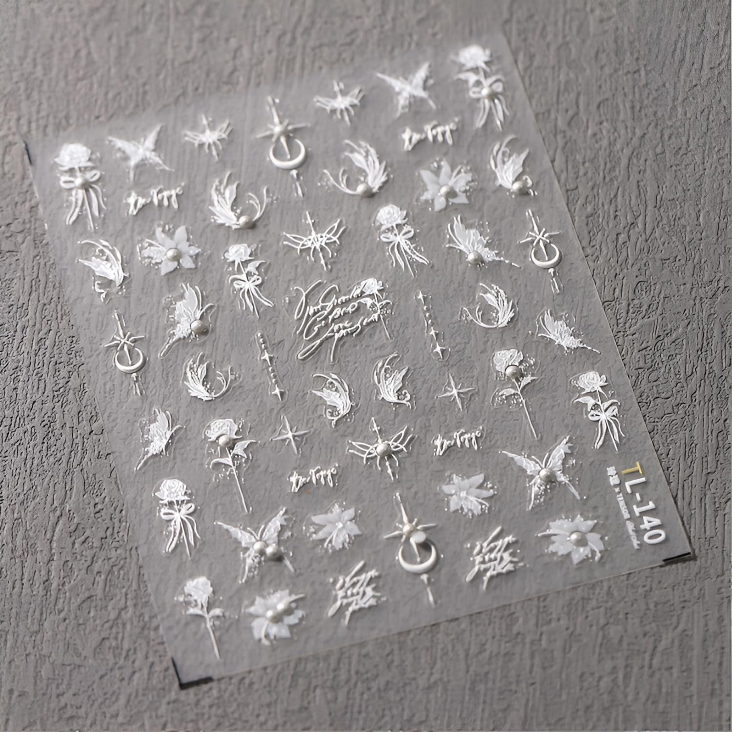5D Embossed White Butterfly Flower Nail Stickers for Nail Art White Moon Star Nail Art Stickers White Nail Decals with Pearl Design Spring Summer Nail Supplies for Women Girls