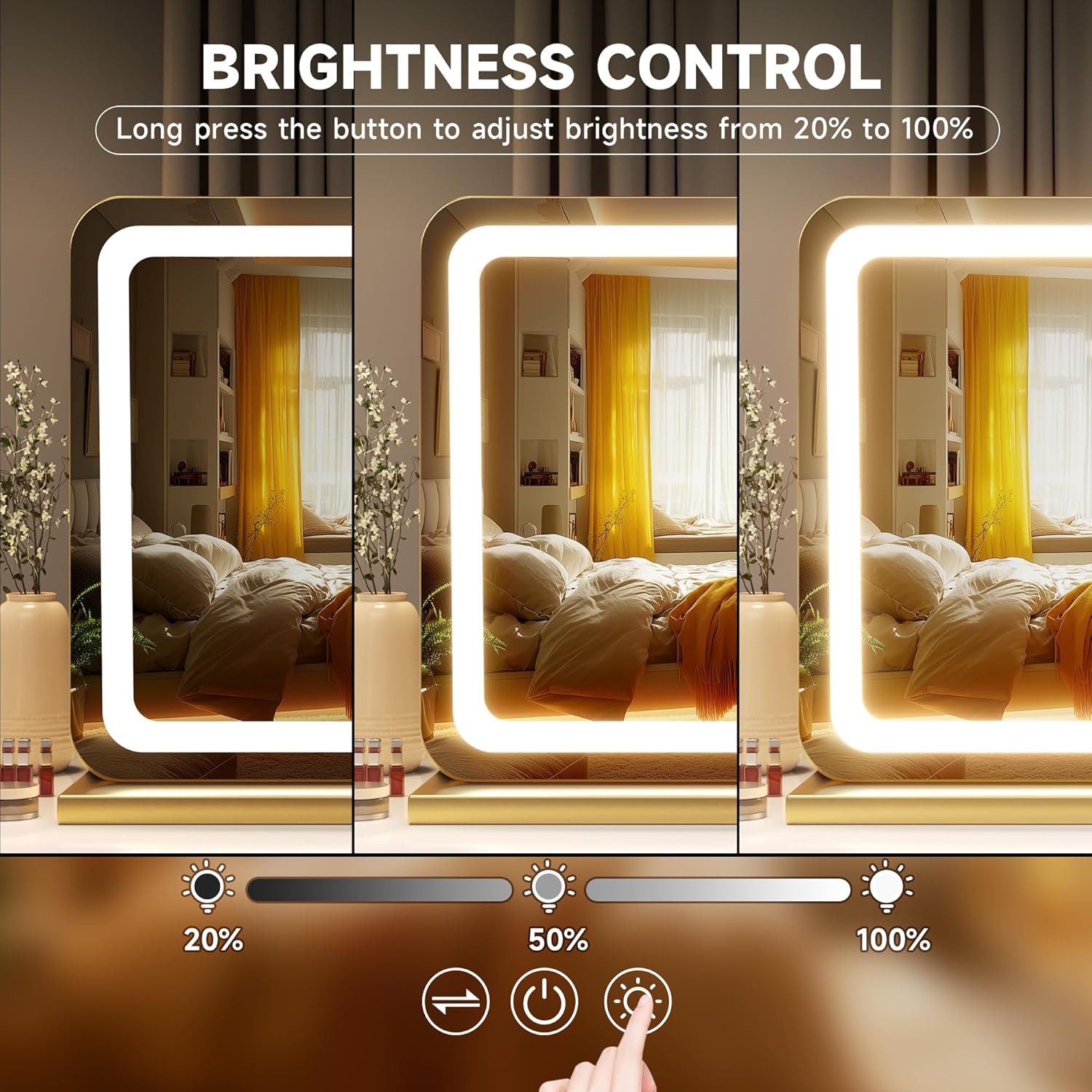 - đăSmart Touch Control & Memory FunctionăThis makeup mirror with lights has 3 smart touch buttons, turn on/off the light by touching the sensor switch, Press left button to change the color modes, long press right button to adjust the led brightness. This lighted makeup mirror is specially designed memory functionfunction keep your lights setting like your last use.