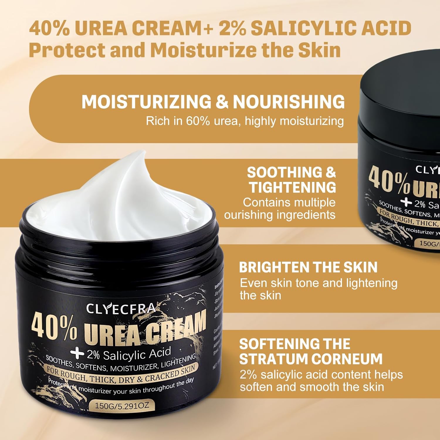 - 【DEEP MOISTURIZING FORMULA】Our cream combines 40% high concentration urea and 2% salicylic acid. Urea can strongly moisturize the bottom layer of the skin, deeply hydrate and lock in water for a long time, solving the problem of dry skin from the root; Salicylic acid gently removes aged keratin, promotes skin metabolism, and works together to keep the skin hydrated, elastic, and tender at all times