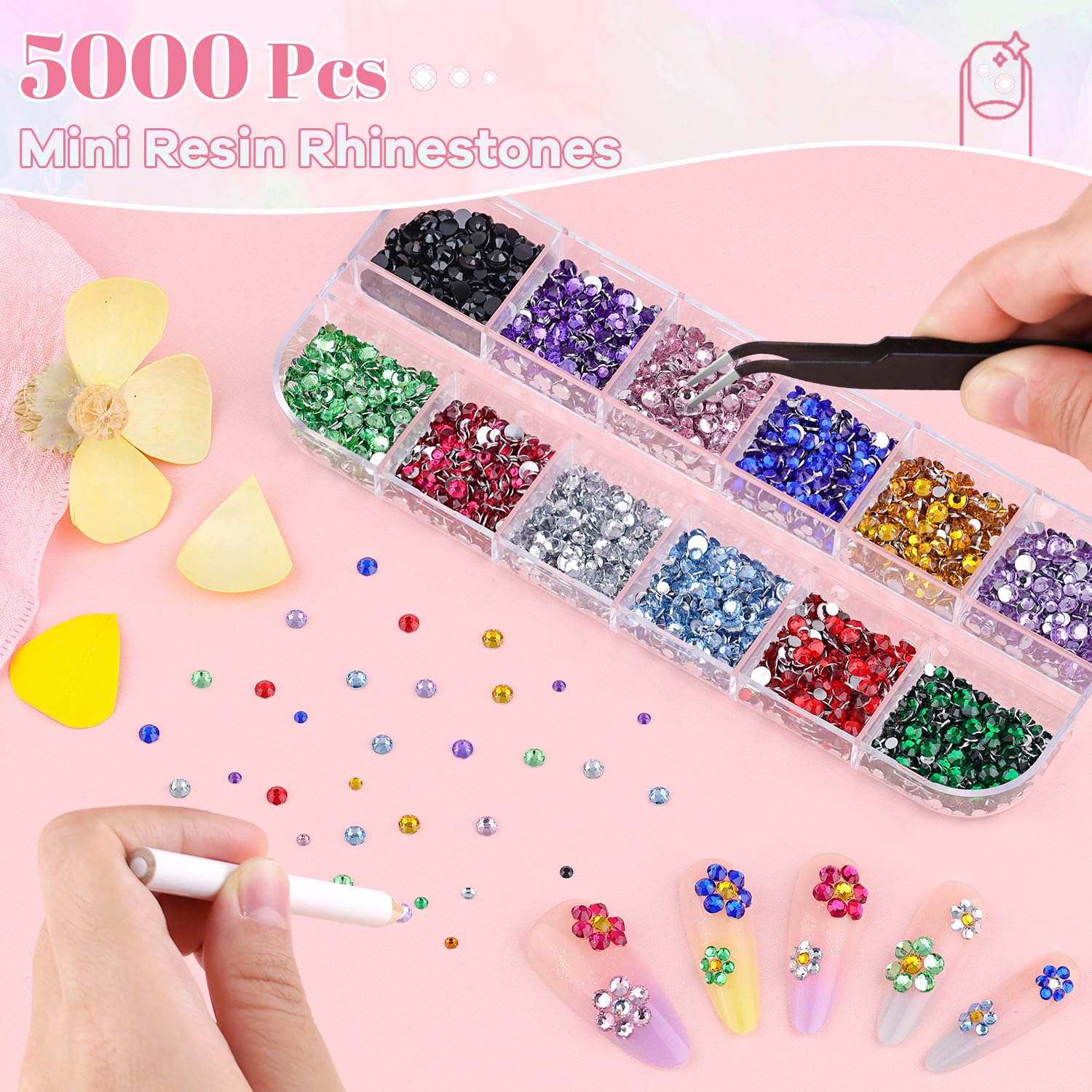 - Package Content -- One package includes approx. 5000 pcs (2/3 mm) Multicolors mini nail gems, 1 tweezers, 1 pick-up pencil. The nail kit with sufficient tools can easily meet your nail design needs at home