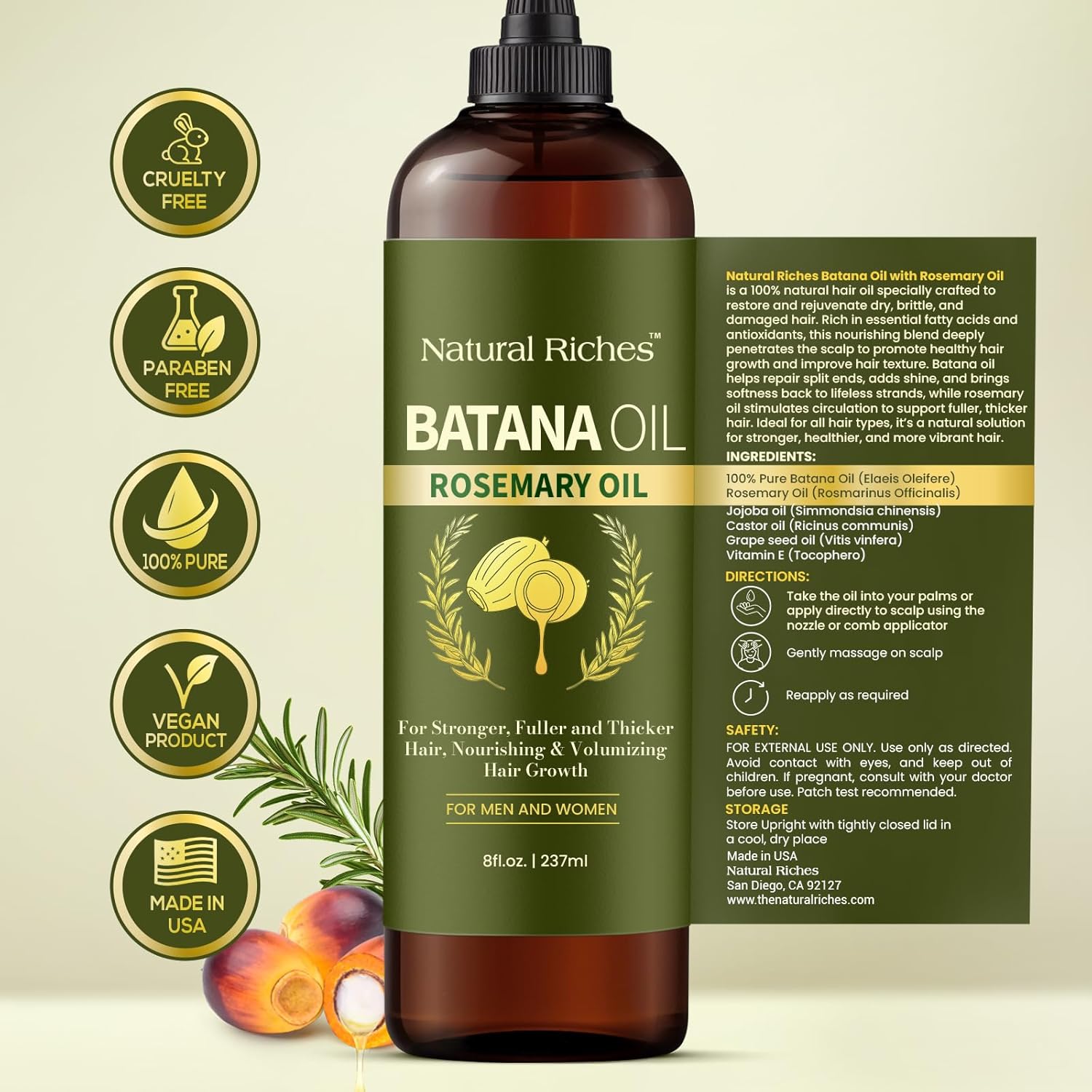 Natural Riches Rosemary & Batana Hair Oil (8 fl oz) | Revitalizing and Strengthening Hair Treatment for Fuller, Healthier-Looking Hair | Paraben Free | Suitable for All Hair Types