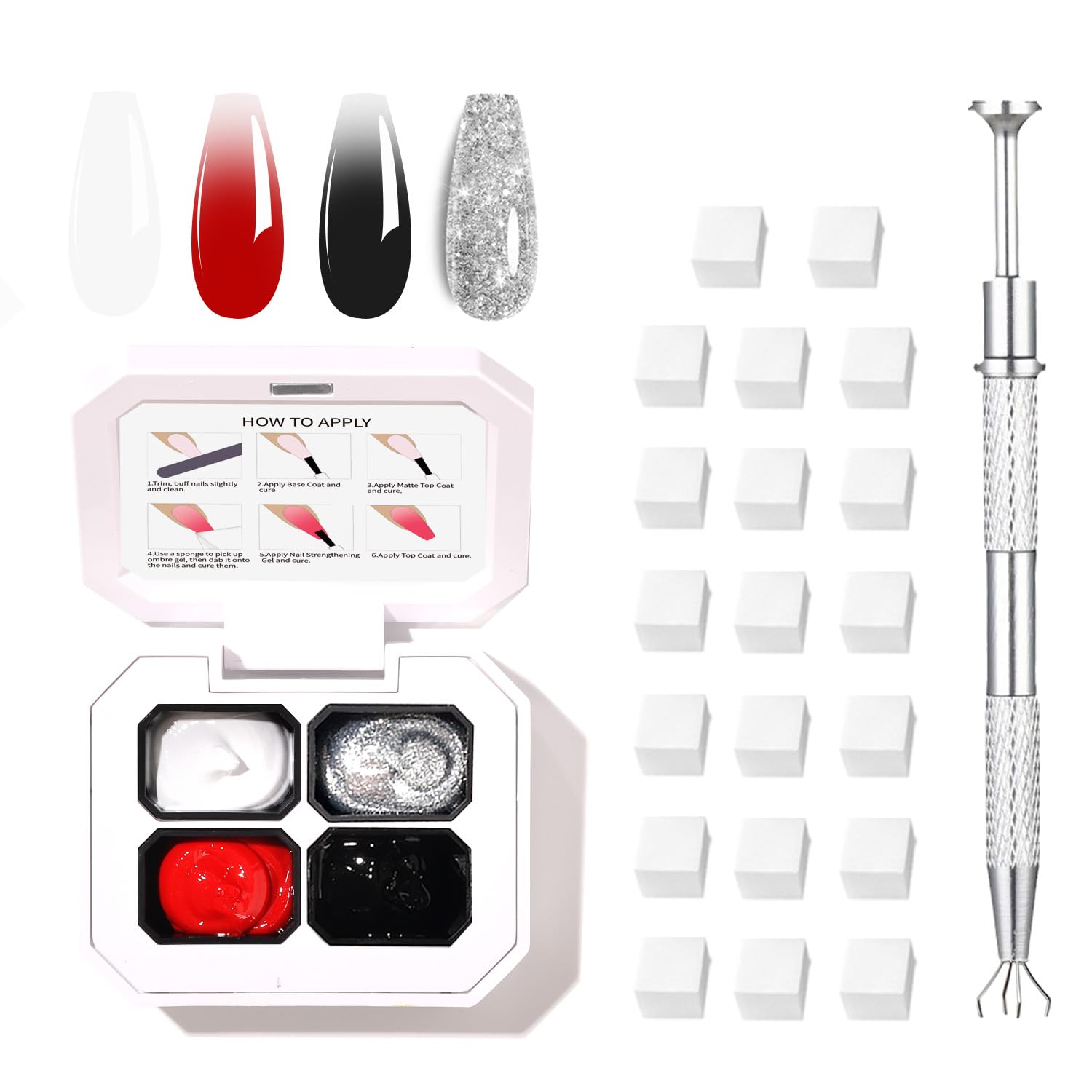 - Included Components : 4-color set of ombre gel, 20 nail sponges, 4-claws metal grabber