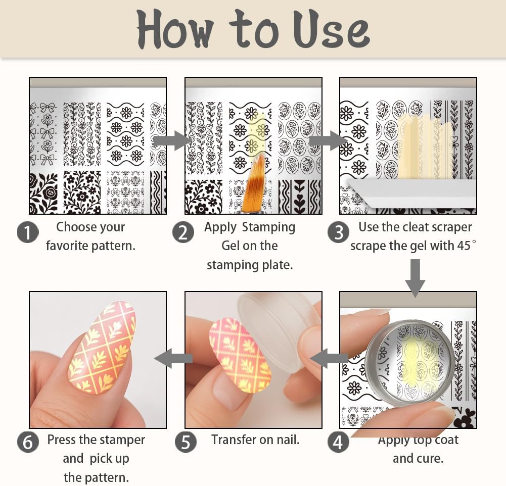 - Easy to Use: You need peel off the blue protective film before using, apply stamping gel or polishes on the pattern, and scrape off the excess with the scraper, then use the stamper to pick up and move the image quickly, to finally press the stamp on the nail to get the nail pattern that you want.