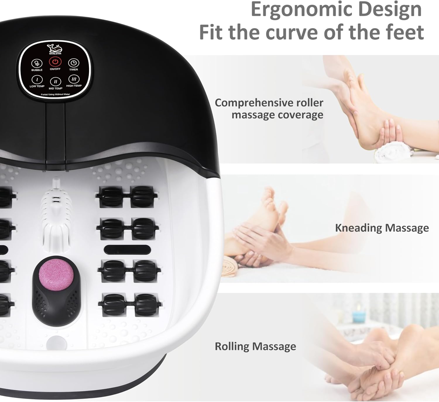 - 【Fast Heating & Temperature Control】WHALSTAR Foot Spa Bath Massager with Heat Bubbles and Vibration Massage and Jets can heat up water efficiently and maintain water at selected temperature (105-113°F). Its 500W PTC Heater is with safe and secure multi-insulation protection and overheating protection, so you needn't worry about the safety. For home pedicure foot spa soak, soaking feet in WHALSTAR foot bucket can not only enhance the therapeutic effect, but also relieve fatigue, swelling & redness.
