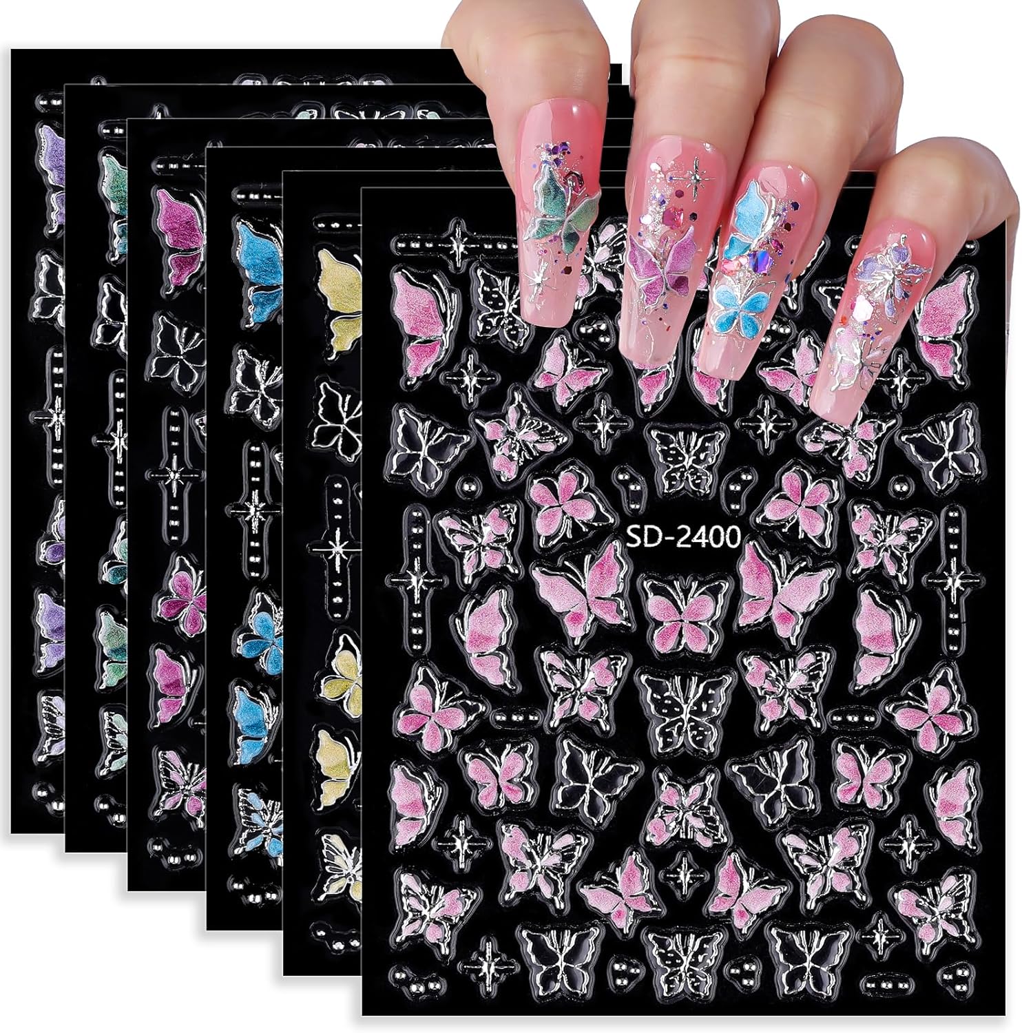 - 6 Sheets 300+ 5D Nail Art Stickers: You’ll get 6 sheets of nail art decals with about 350 pieces in 6 colors like pink, purple, blue, and green. These nail design stickers feature realistic butterflies and stars – the vivid designs make it super easy to create salon-style nails yourself, whether you’re a beginner or a pro.