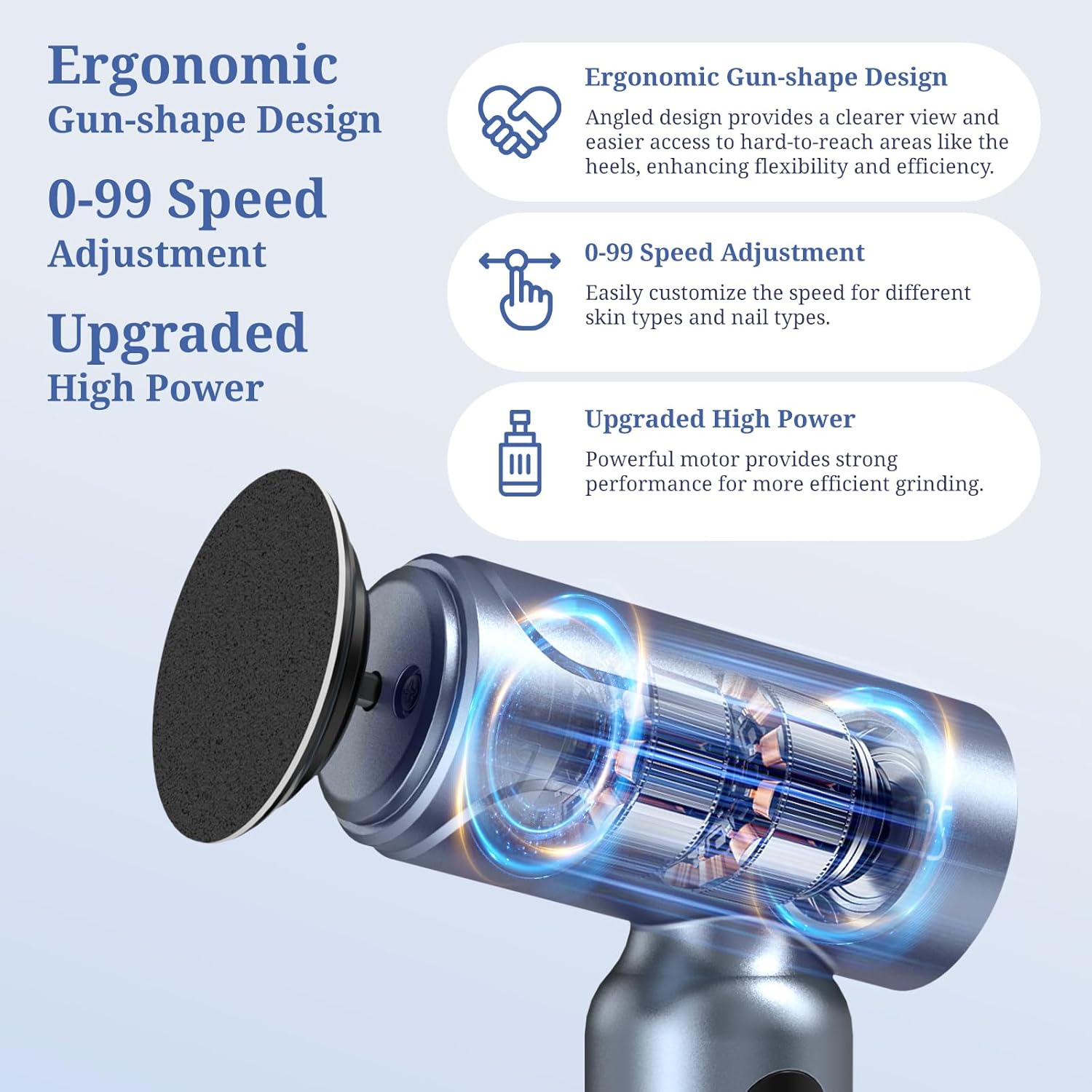 - [Gun-Shaped Design] Electric Foot Filer adopts a gun-shaped design. Compared with the straight-barrel design, the gun-style foot cuticle grinder is more labor-saving and easier to control in operation. Its ergonomic grip reduces hand fatigue during long use. The angled design also offers a clearer view while grinding, making it easier to reach and treat hard-to-access areas like the heels, making it more flexible and efficient. Give you a more professional foot care experience