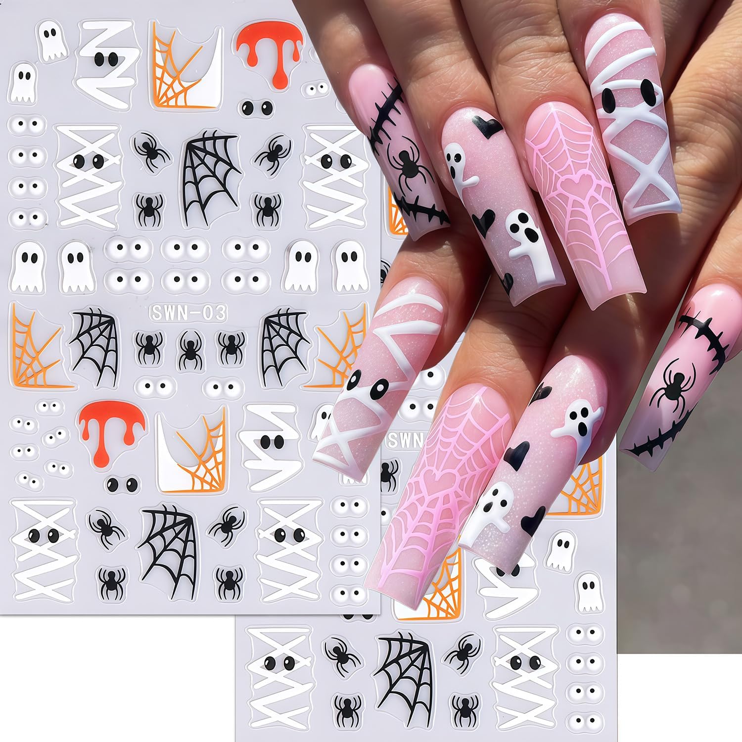 - Quantity: You will get 6 sheets of ghost nail stickers, including cute pumpkin and spider web designs, not easy to fall off or fade, can easily create a variety of themed nail art, meet the needs of reusable